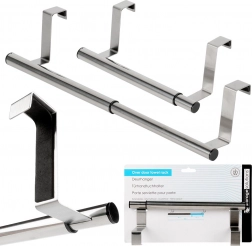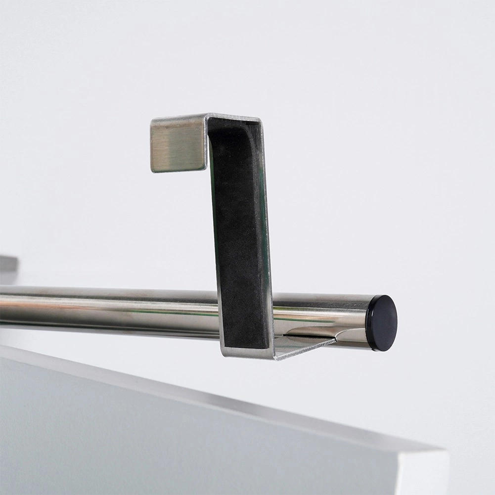 Praktický dveřní věšák z nerezové oceli s nastavitelnou délkou 25–40 cm pro skříňky a zásuvky. Bez vrtání, stačí zavěsit na hranu dvířek do tloušťky 2 cm. Ideální do kuchyně i koupelny pro ručníky a utěrky, s ochrannými filcovými podložkami proti poškrábání.