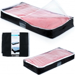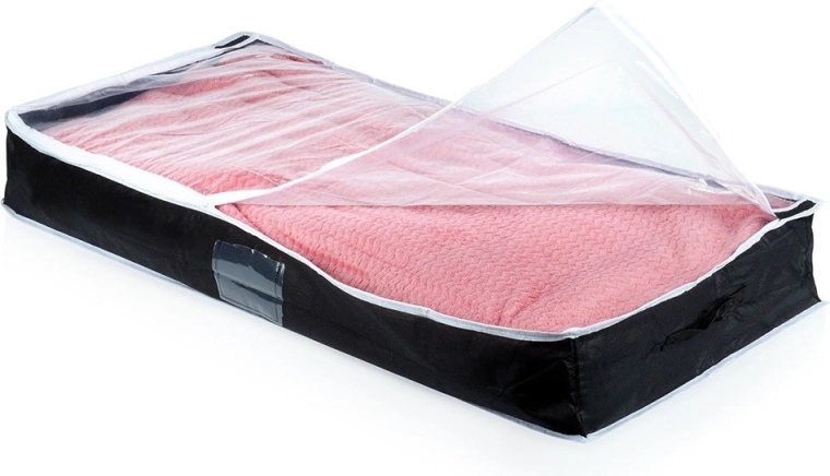 Vak je vybaven pevným dvojitým zipem v kontrastní bílé barvě pro rychlý přístup a bočním uchem pro snadné vysouvání zpod postele či z horních polic. Minimalistický design a plochý tvar šetří prostor a pomáhá chytře organizovat domácnost.