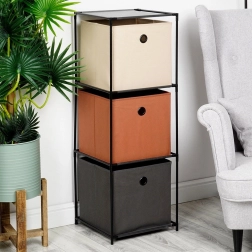 Tento úzký regál s rozměry 34,5 × 34,5 × 100 cm kombinuje odolný černý kovový rám a tři textilní boxy v barvách béžová, hnědá a antracit. Každý box má kovové očko pro snadnou manipulaci a je skládací, takže při nepoužívání nezabírá místo. Ideální řešení pro přehledné třídění a skladování.
