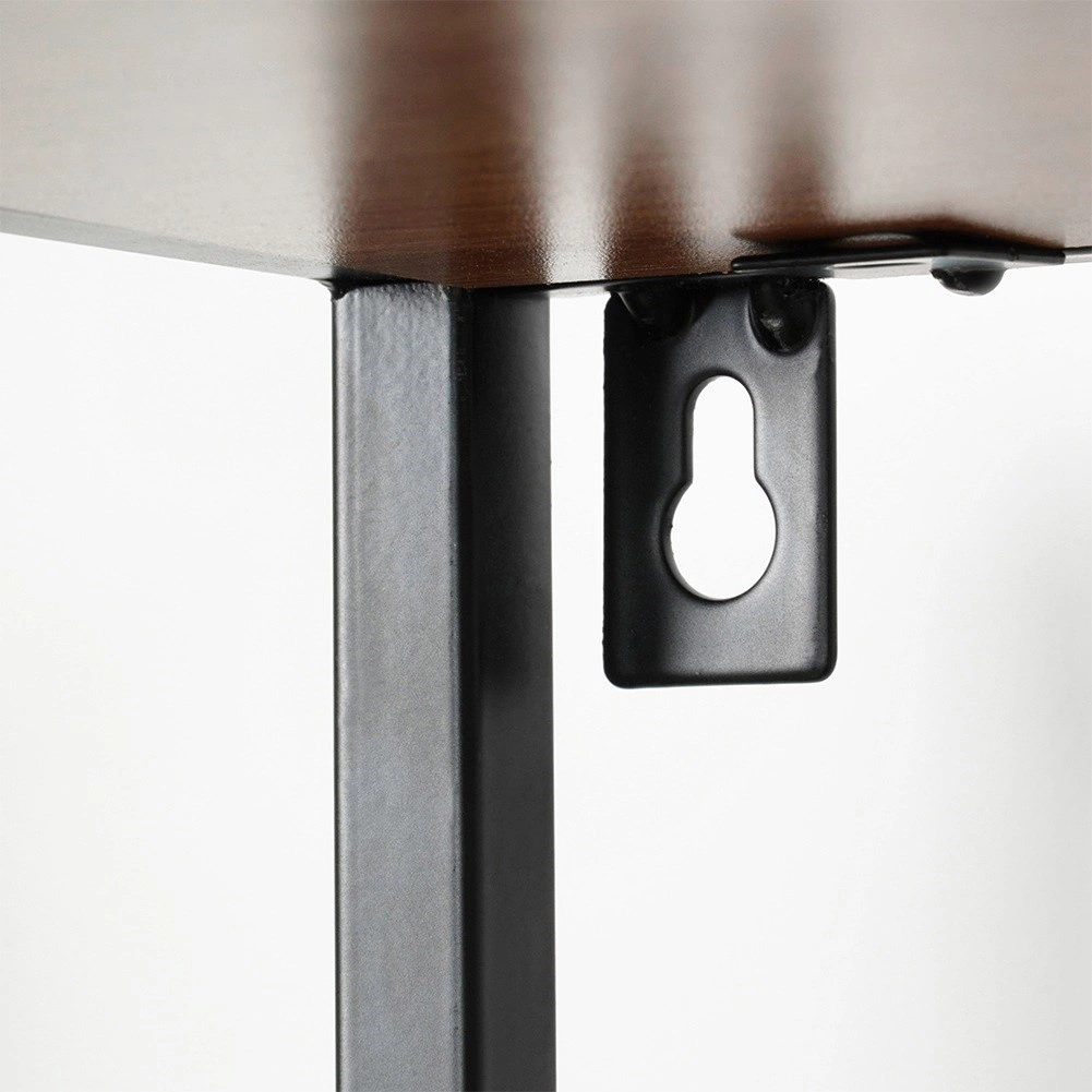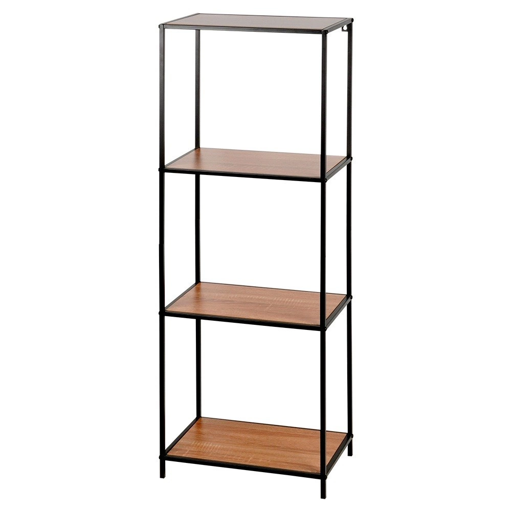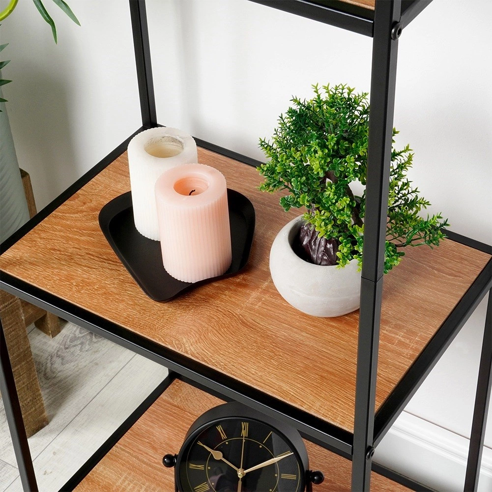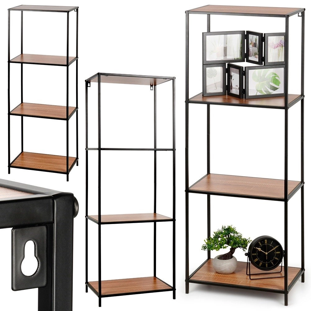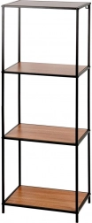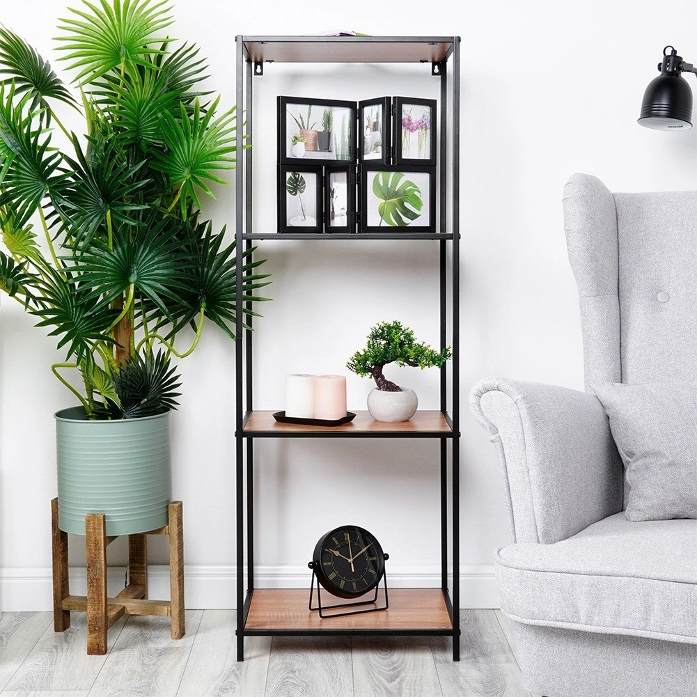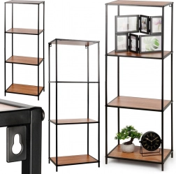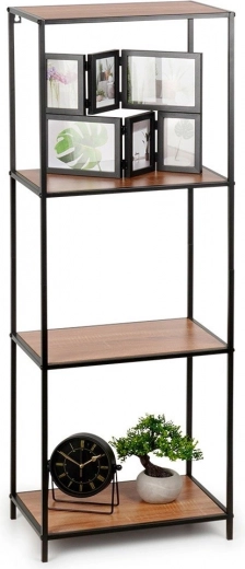 Stylový policový regál v černém kovu a s dekorem dřeva spojuje funkčnost a moderní design. Čtyři prostorné police pojmou knihy, dekorace, rostliny i kuchyňské doplňky a pomohou udržet domácnost přehlednou. Otevřená konstrukce působí vzdušně a podtrhuje industriální charakter interiéru.