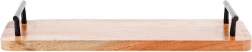 Toto obdélníkové servírovací prkénko z akáciového dřeva kombinuje funkčnost a moderní loftový vzhled. Dva pevné kovové úchyty v černé barvě zajišťují stabilní úchop a pohodlné přenášení nápojů i pokrmů. Hladký dřevěný povrch je vhodný pro přímé servírování občerstvení a snadno se čistí.