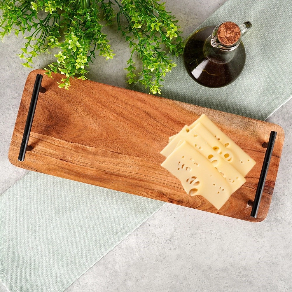 Elegantní servírovací prkénko z akáciového dřeva s černými kovovými úchyty pro snadné přenášení. Ideální pro sýry, předkrmy, dezerty i snídaně, skvělé do domácnosti i gastronomie. Přírodní dřevo v industriálním stylu dodá stolování jedinečný vzhled. Rozměry: 40 × 15,5 × 5 cm.