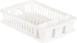 Praktický bílý odkapávač na nádobí o rozměrech 39,5 × 26 × 8,5 cm pro přehledné sušení talířů, sklenic a příborů. Nabízí velkou kapacitu, vyjímatelnou odkapávací tácu a odolné plastové provedení, které chrání kuchyňskou desku před vodou a usnadňuje údržbu.