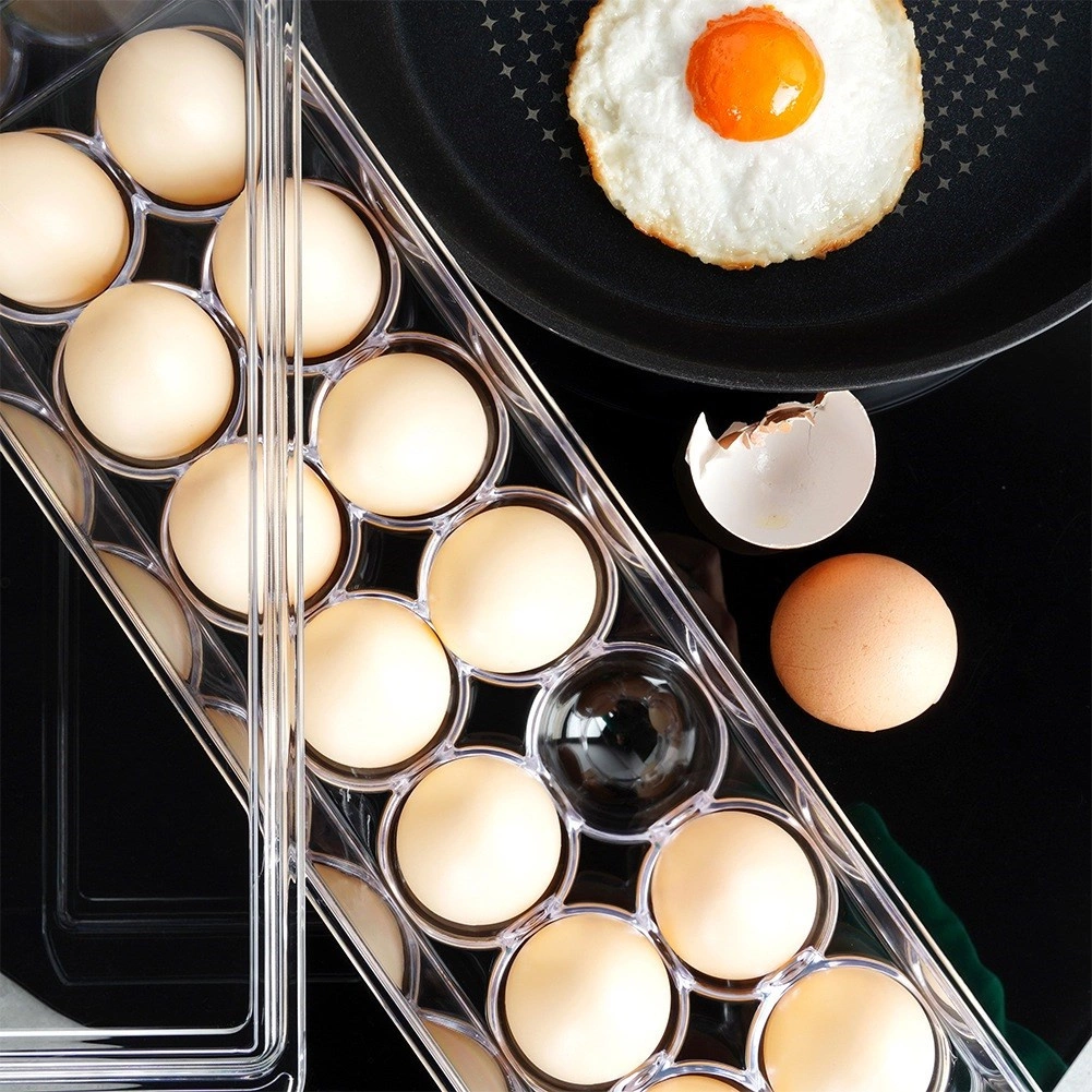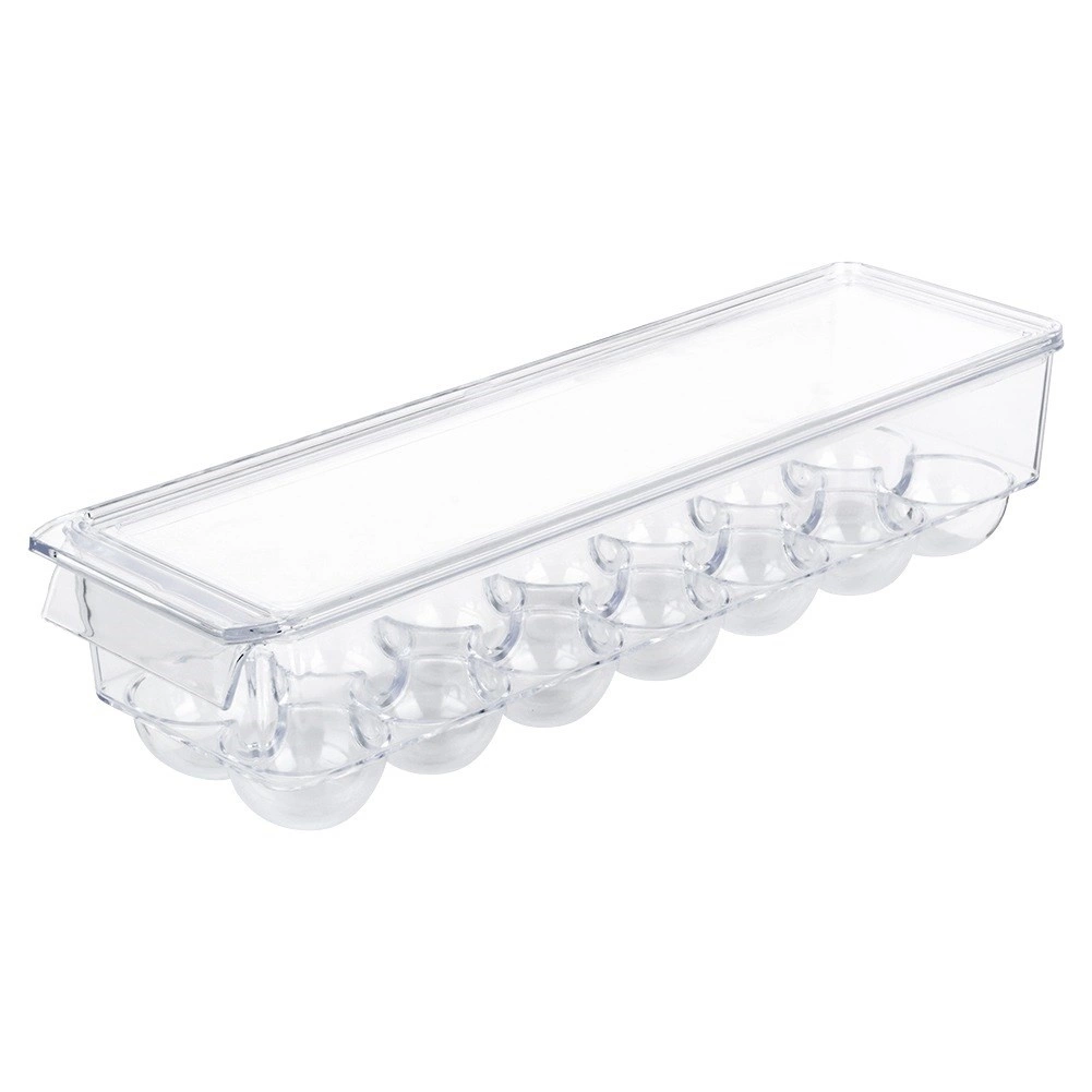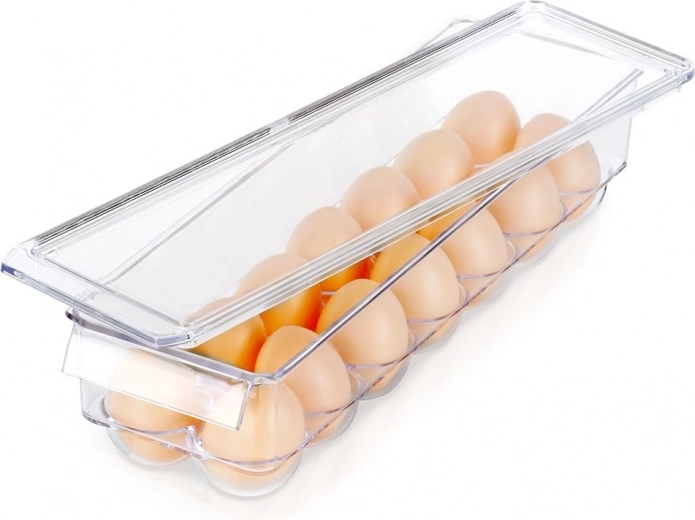 Praktický organizér na vejce s víkem pojme až 14 kusů a udrží je v lednici přehledně a bezpečně. Díky průhlednému plastu máte vždy přehled o zásobách, tvarované přihrádky chrání před kutálením a prasknutím a pevné víko brání pohlcování pachů i vlhkosti. Kompaktní rozměry šetří místo a umožňují stohovatelné uložení.