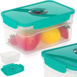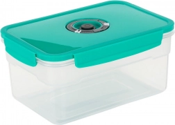 Udržte své potraviny déle čerstvé s vakuovou dózou o objemu 2,3 l a rozměrech 23 × 16 × 11 cm. Díky integrovanému ventilu ve víku snadno odsajete vzduch (pomocí ruční pumpičky) a minimalizujete oxidaci i ztrátu chuti. Průhledné tělo usnadní kontrolu obsahu, tyrkysové víko se čtyřmi klipy zajistí spolehlivé a těsné uzavření.