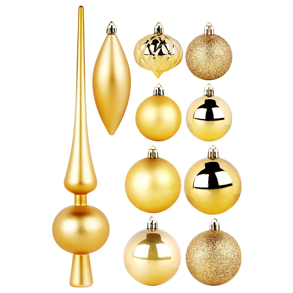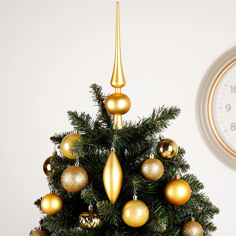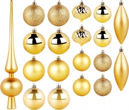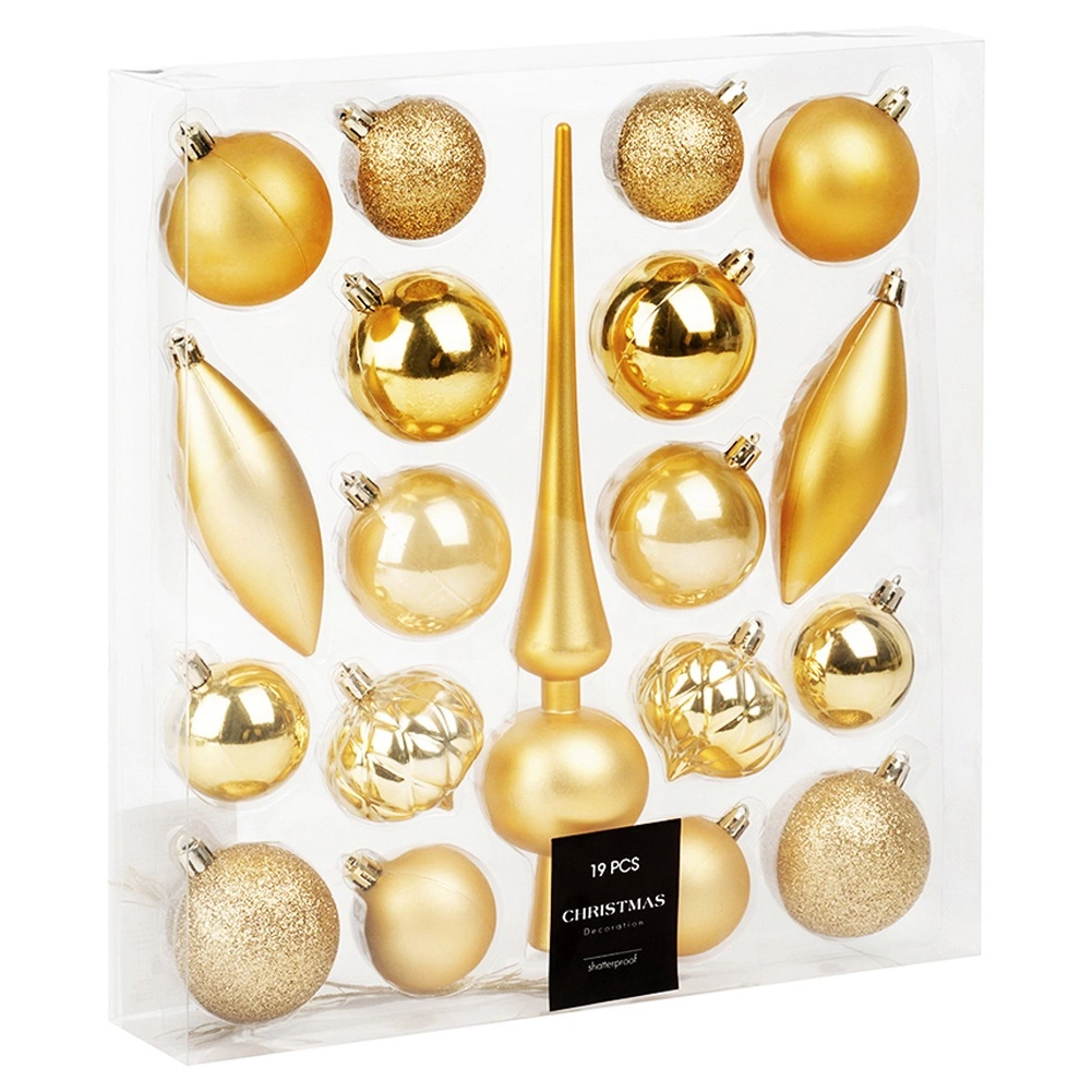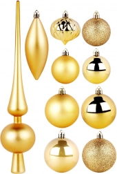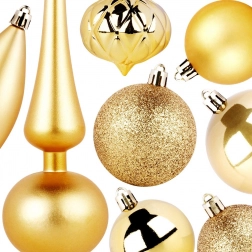 Tato univerzální sada 19 zlatých ozdob kombinuje různé tvary a povrchové úpravy pro bohatý a vyvážený vzhled stromku. Najdete v ní matné, lesklé, perleťové i třpytivé koule, elegantní špici a dvojici kapkových „soplů“. Lehký a odolný materiál zajišťuje spolehlivost a dlouhou životnost bez rizika rozbití.