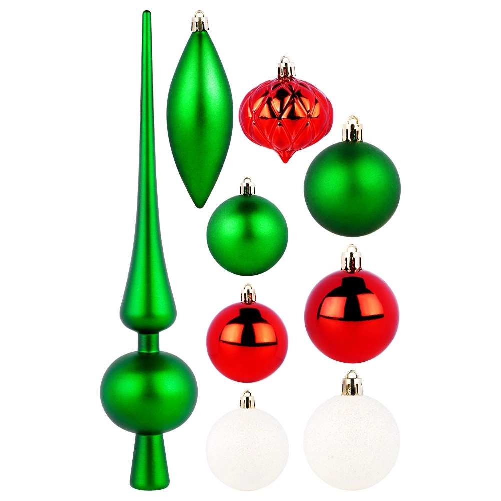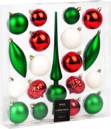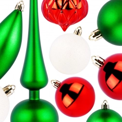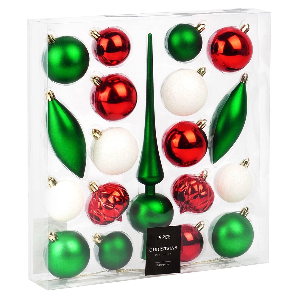 Stylová sada vánočních ozdob obsahuje 18 netříštivých baněk a 1 špici v zelené, červené a bílé barvě s matným, lesklým a glitrovým povrchem. Odolné ozdoby jsou bezpečné pro děti i domácí mazlíčky, snadno se věší a dodají vaší vánoční výzdobě eleganci a třpyt.