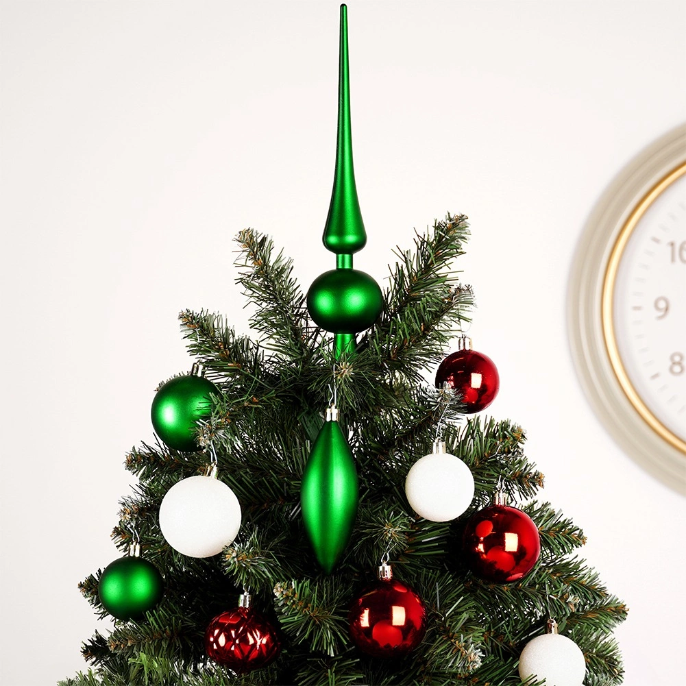 V balení najdete špičku v zelené matné barvě, elegantní soplíky a mix koulí v oblíbených svátečních tónech. Ozdoby mají praktická očka a provázky pro rychlé zavěšení.