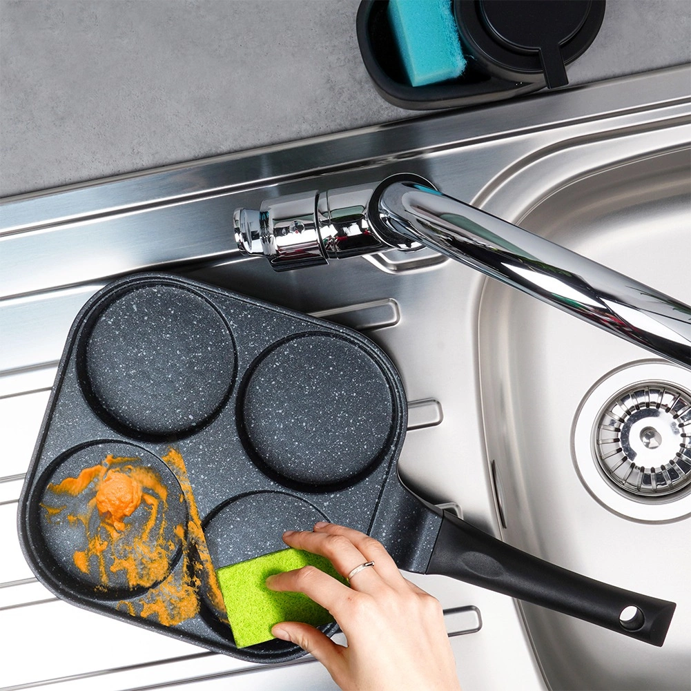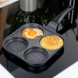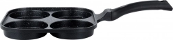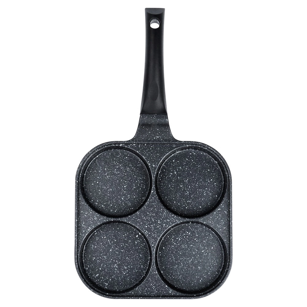 Čtvercová pánev 22 × 22 cm se čtyřmi samostatnými komorami zajistí jednotnou velikost porcí a perfektní vzhled snídaně. Hliníkové tělo s granitovou nepřilnavou vrstvou se rychle zahřívá a výtečně rozvádí teplo, takže smažíte rychle, úsporně a bez připalování. Ergonomická, protiskluzová rukojeť s otvorem na zavěšení zaručuje pohodlné a bezpečné používání.