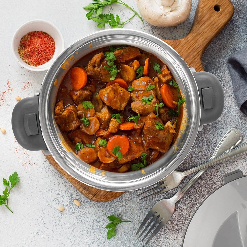 Uchovejte polévky, hlavní jídla i dezerty v ideální teplotě díky robustní nerezové termomíse 2 l. Vnitřek z nerezové oceli se snadno čistí, vnější odolný plast chrání před popálením a zajišťuje pohodlné držení. Víko se uzavírá snadným pootočením a spolu s postranními úchyty zaručuje bezpečné přenášení.