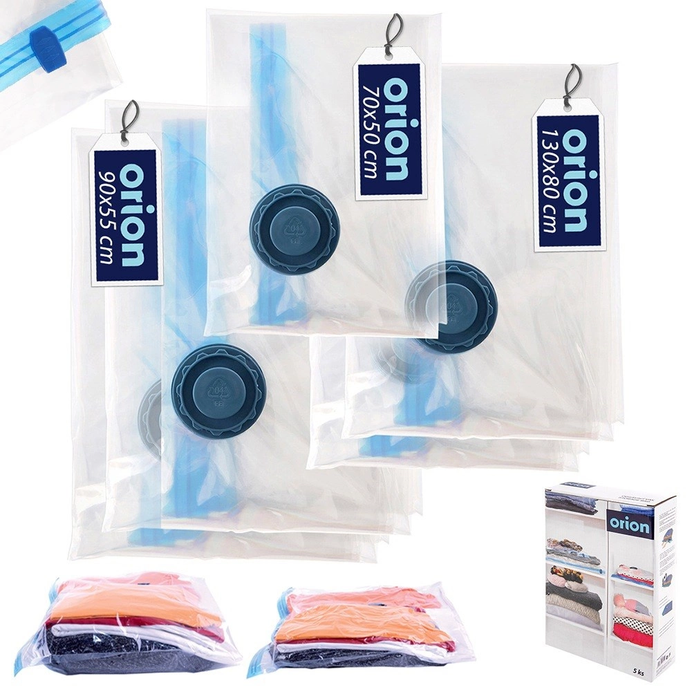 Praktická sada 5 vakuových sáčků ve třech velikostech vám ušetří až 75 % místa ve skříni i kufru. Sáčky jsou z odolné průhledné folie se zpětným ventilem a hermetickým dvojitým zipem, který brání úniku vzduchu. Ideální pro sezónní oblečení, peřiny a povlečení, ale i plyšové hračky – chrání před prašností, vlhkostí, roztoči a moly.