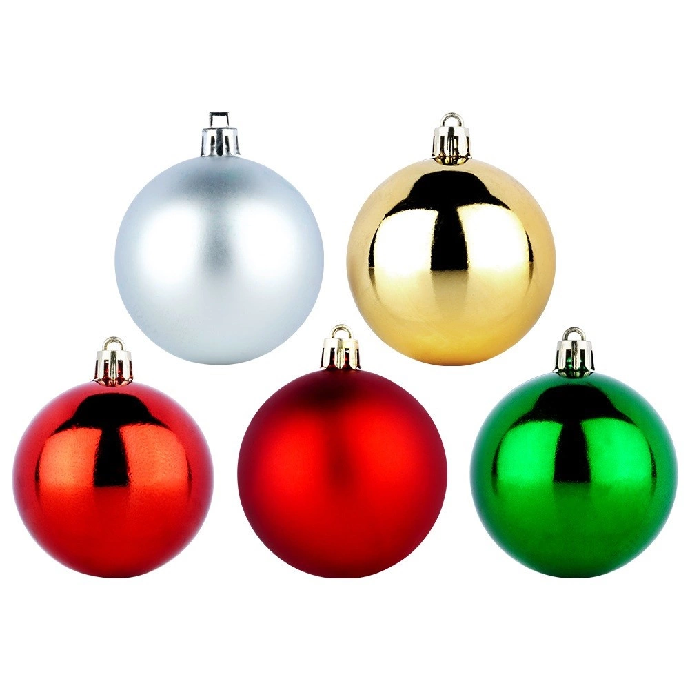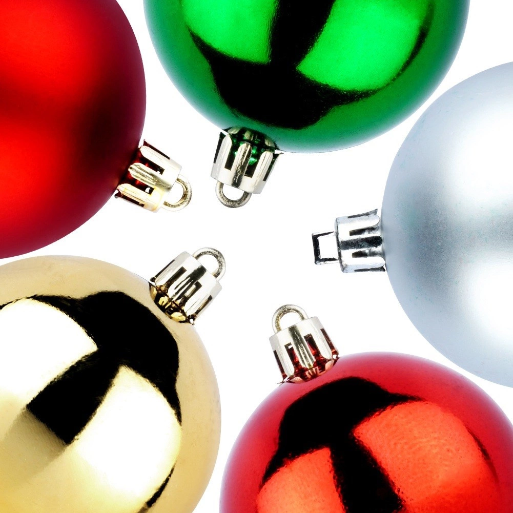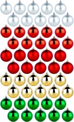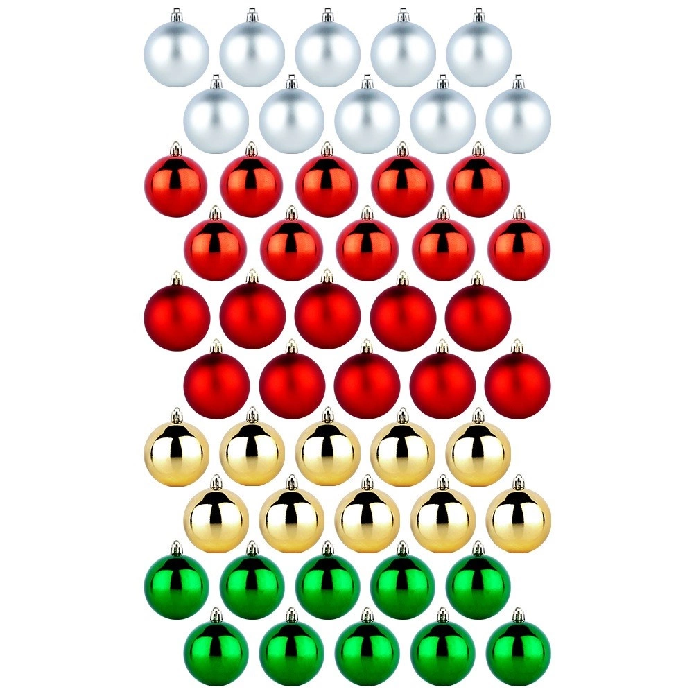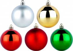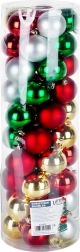 Stylový set 50 vánočních ozdob o průměru 6 cm v barvách červená, zelená, zlatá a stříbrná. Kombinuje lesklé i matné povrchy, je neroztříštitelný a bezpečný pro děti i domácí mazlíčky. Součástí jsou šňůrky na zavěšení – ideální pro vánoční stromek, věnce a girlandy.