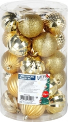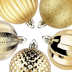 V balení najdete mix lesklých, matných, brokátových a reliéfních koulí pro vizuální pestrost a působivý třpyt. Díky jednotné zlaté barvě je snadno zkombinujete s dalšími ozdobami a světýlky.