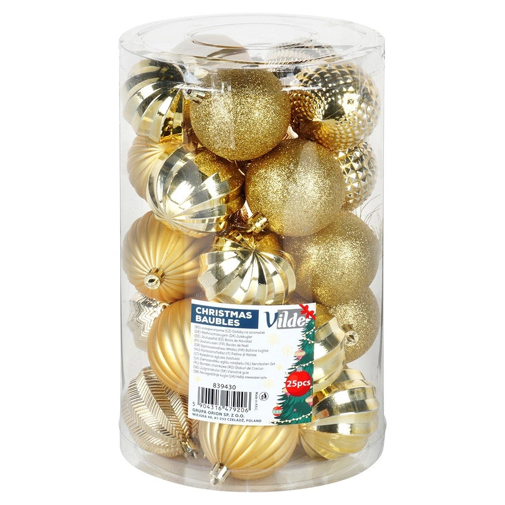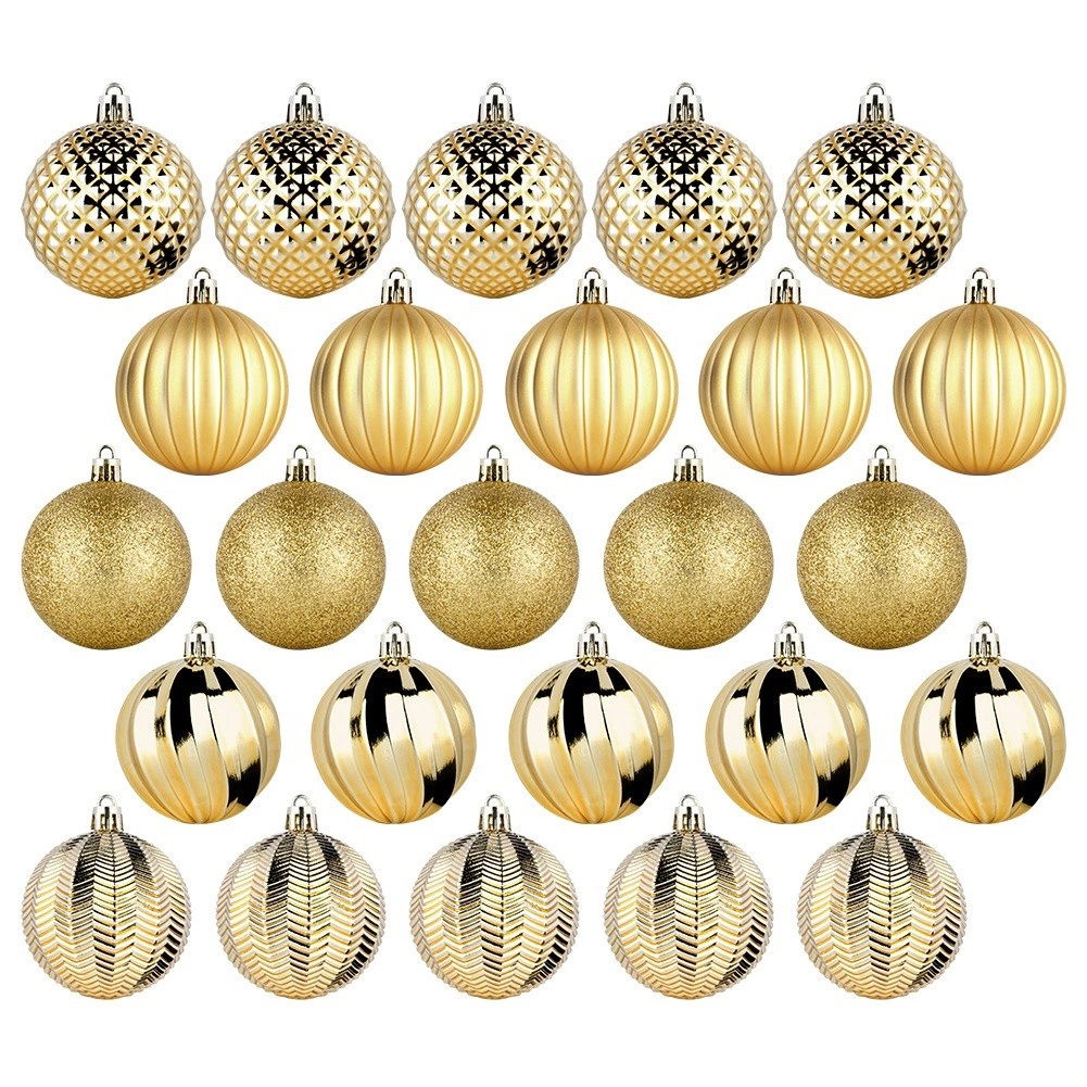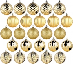 Elegantní sada 25 kusů zlatých vánočních ozdob o průměru 6 cm z nerozbitného materiálu. Kombinuje lesklé, matné, brokátové a reliéfní povrchy pro bohatý efekt a snadné sladění s jakoukoli výzdobou. Bezpečné pro děti i domácí mazlíčky, ideální na stromek, věnce i sváteční dekorace. Šňůrky na zavěšení jsou součástí balení.