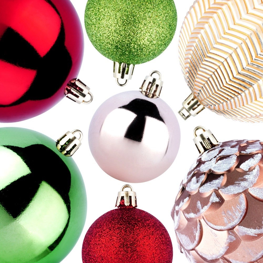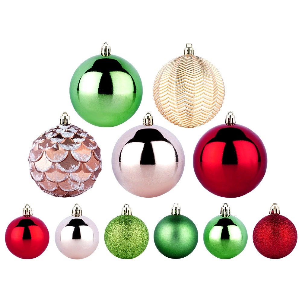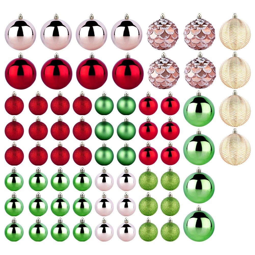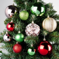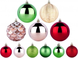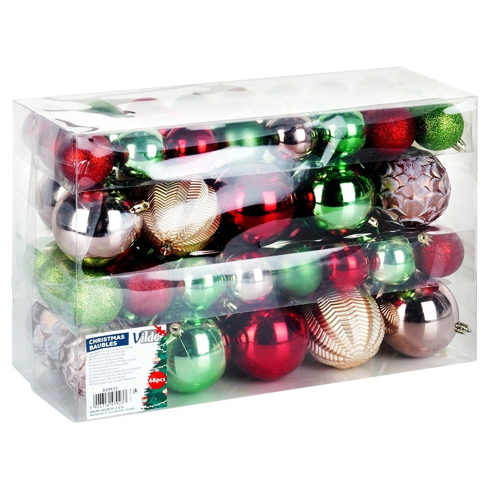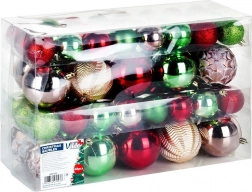 V balení najdete 20 ks koulí o průměru 8 cm (lesklé červené, reliéfní zlaté, lesklé a reliéfní světle růžové, lesklé zelené) a 48 ks o průměru 5 cm (lesklé červené 6×, třpytivé zelené 6×, lesklé světle růžové 6×, třpytivé červené 12×, lesklé zelené 12×, matné zelené 6×). Každá ozdoba má kovové očko a v balení jsou šňůrky pro okamžité zdobení.