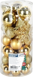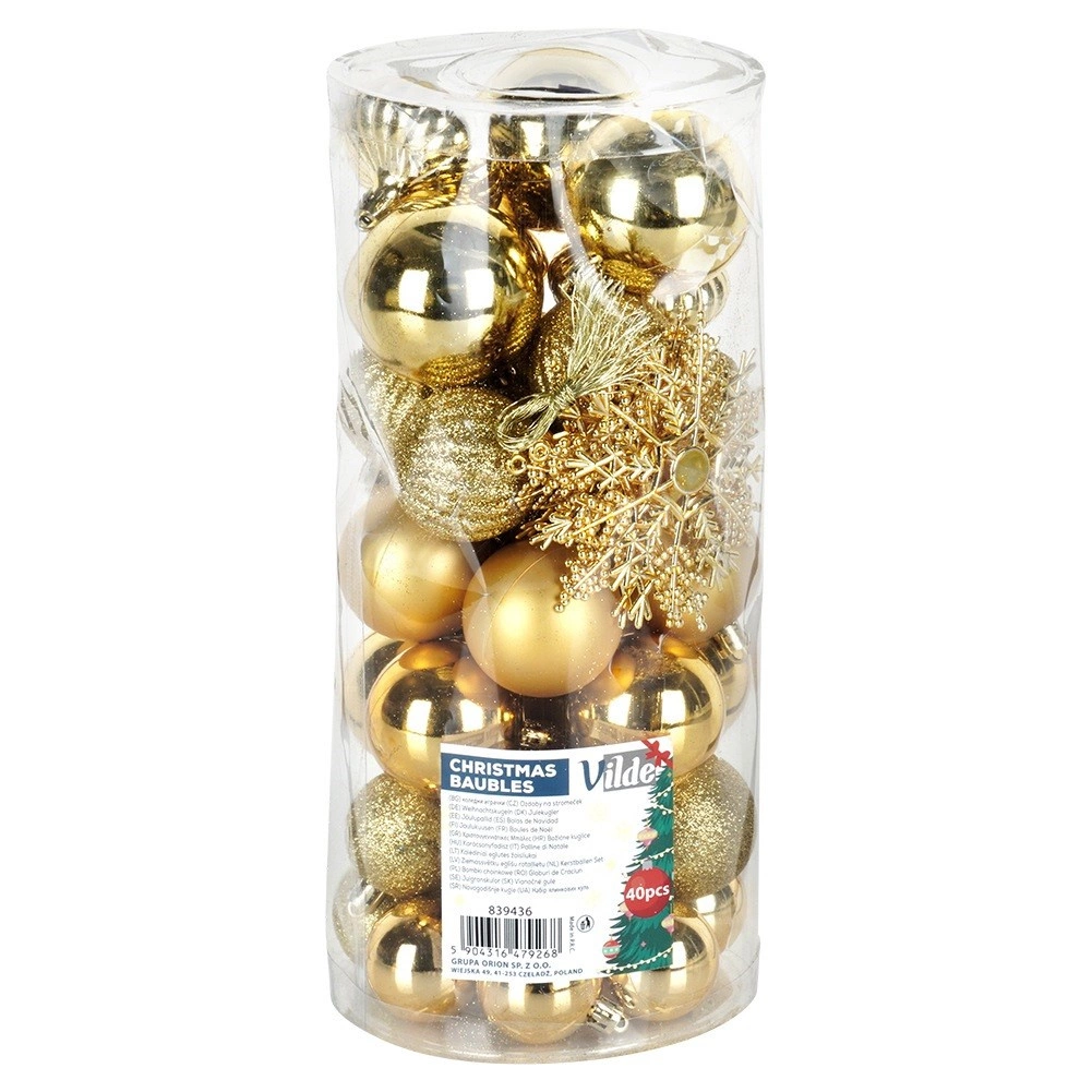 Vytvořte si doma jedinečnou vánoční atmosféru se sadou zlatých ozdob Vilde. Baněčky jsou vyrobené z kvalitního plastu, takže jsou neroztříštitelné a výrazně odolnější než skleněné, přesto si zachovávají elegantní vzhled skla. Různé povrchové úpravy v jedné barvě umožní harmonické a přitom dynamické zdobení stromku, věnců či girland.