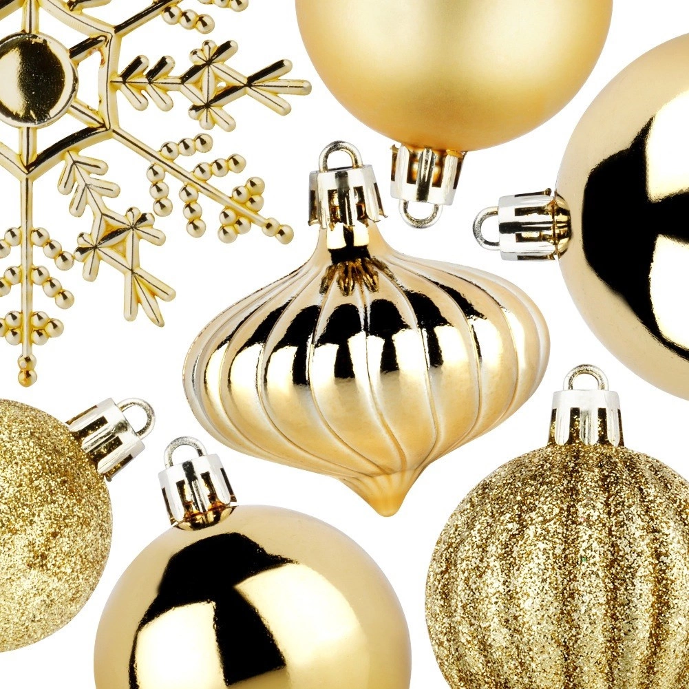 Lesklé, matné, třpytivé i reliéfní baňky ve sjednocené zlaté barvě vytvářejí harmonickou, ale vizuálně bohatou výzdobu.
