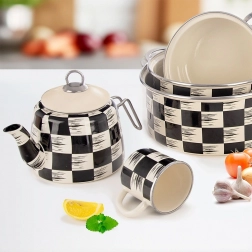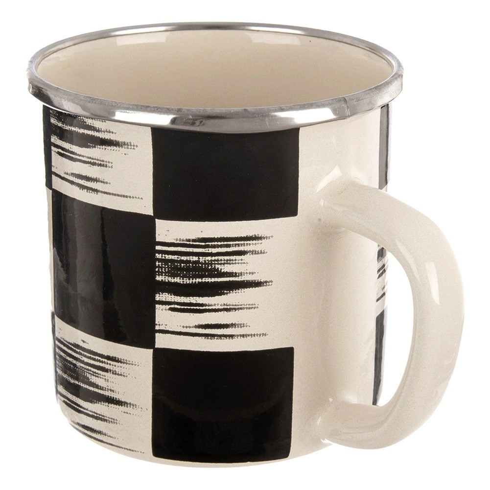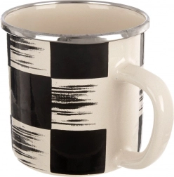 Smaltovaný hrnek Šachovnice kombinuje nadčasový retro vzhled s moderní funkčností. Maximální objem 400 ml a rozměry 12 × 9 × 8,5 cm z něj dělají skvělého parťáka pro kávu, čaj i kakao. Vnější strana s výraznou černo‑béžovou kostkou a krémovým vnitřkem doplněná nerezovým lemem je nejen stylová, ale i praktická a snadno se čistí.