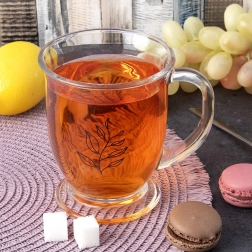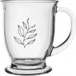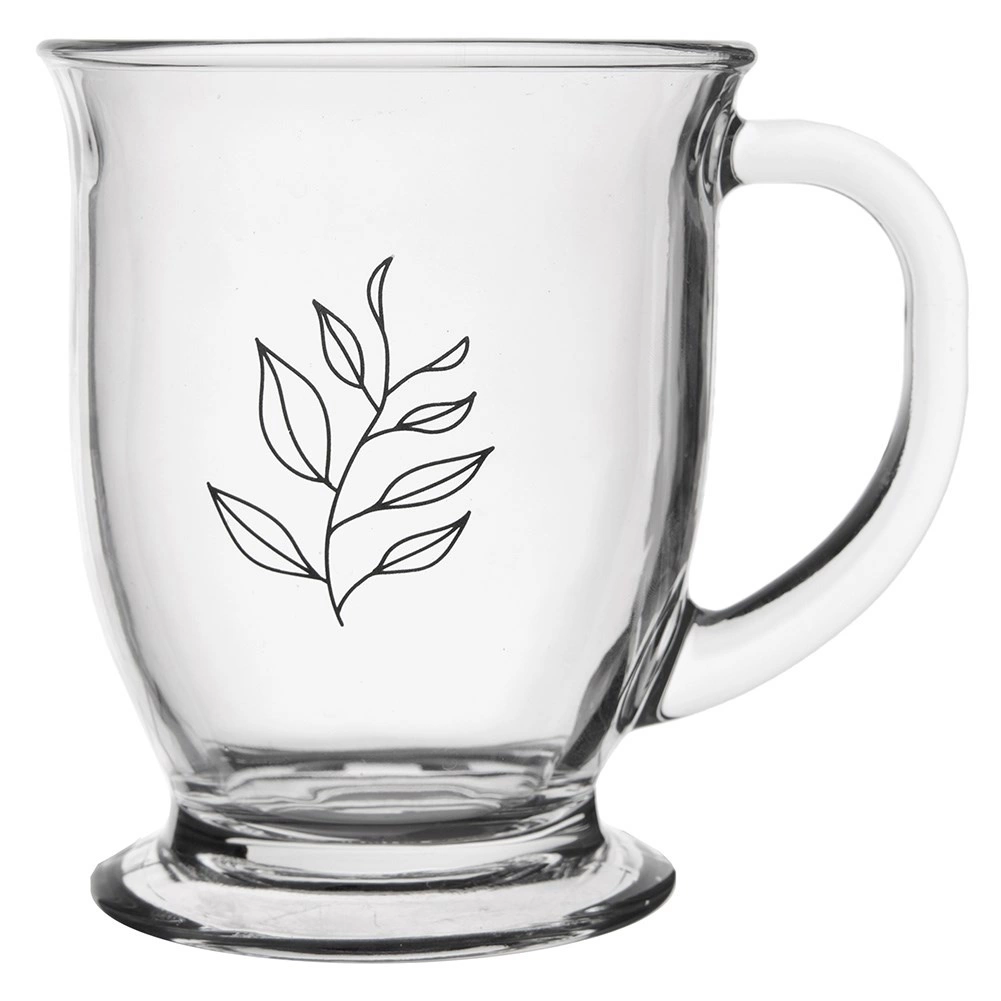 Praktický skleněný hrnek o objemu 450 ml pro každodenní pití čaje, kávy i kakaa. Vyroben z kvalitního silného skla s odolným uchem, má stabilní podstavu a motiv listu, který dodá eleganci každému stolování. Vhodný do myčky i mikrovlnky.
