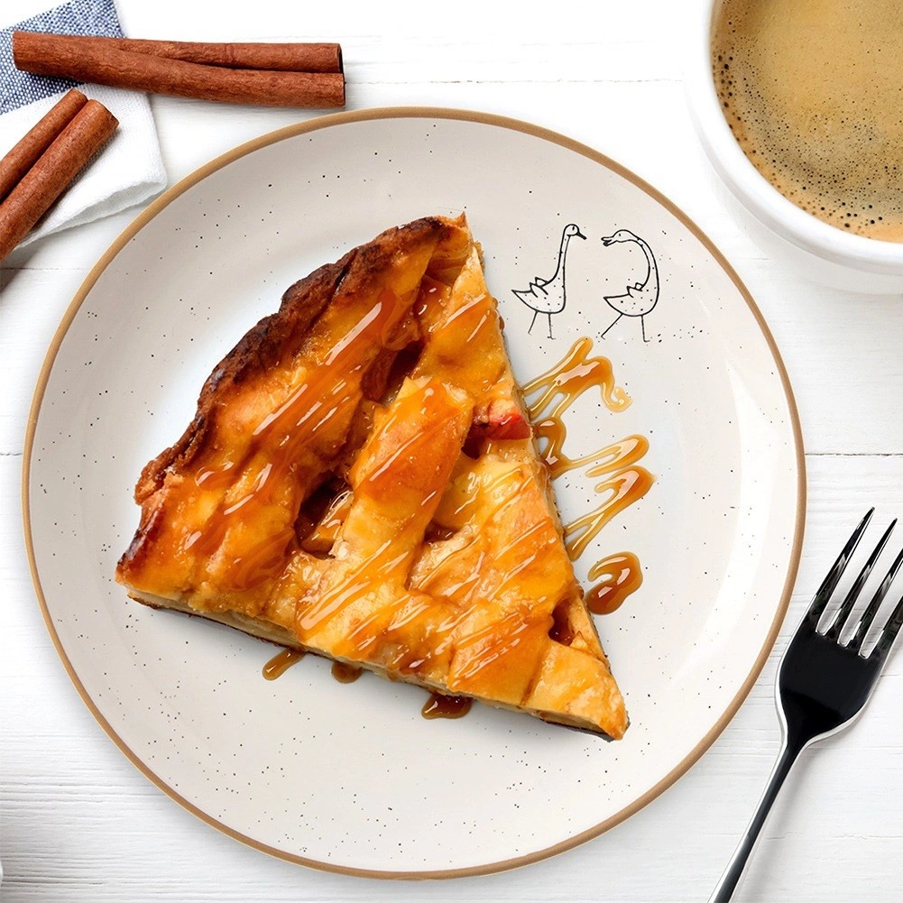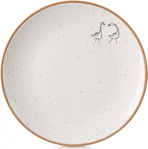 Stylový dezertní talíř o průměru 20 cm z kvalitní keramiky v béžové barvě s jemným kropením a přírodním kameninovým okrajem. Skvěle se hodí na podávání dortů, dezertů a drobných pochoutek, a to jak doma, tak v restauraci. Je vhodný do myčky nádobí i mikrovlnné trouby, má klasický kulatý tvar a efektní design s decentním reliéfem s motivem hus.