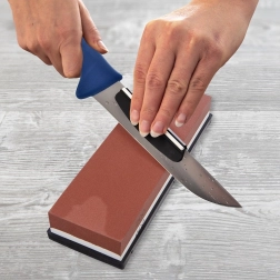 Protiskluzová silikonová podložka drží kámen pevně na místě, takže se při broušení nehne. Kámen je určen pro broušení na mokro – stačí jej před použitím namočit na cca 10 minut a během broušení průběžně zvlhčovat. Po práci nechte přirozeně vyschnout. Nevhodné pro zubaté a keramické nože.