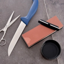 Protiskluzová silikonová základna zajišťuje pevnou oporu. Vhodné pro kuchyňské nože, nůžky, dláta i zahradní nářadí.