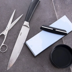 Obnovte ostří svých kuchyňských nožů snadno a bezpečně. Dvoustranný vodní brousek z odolného korundu kombinuje hrubou stranu #240 pro rychlé srovnání ostří a jemnou stranu #1200 pro finální dobroušení a leštění. Protiskluzová silikonová podložka drží kámen stabilně na místě, zatímco přiložená vodicí lišta zajišťuje konzistentní úhel a profesionální výsledek.