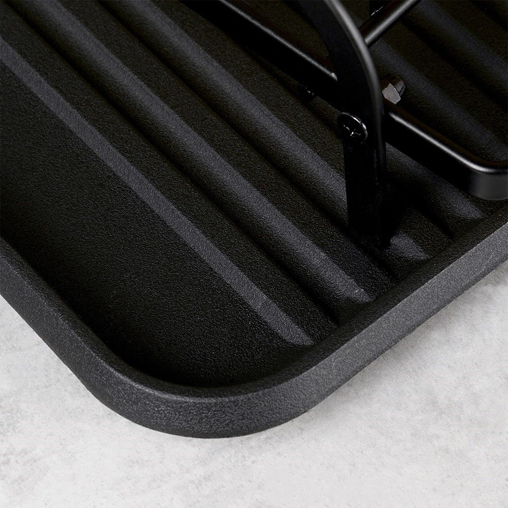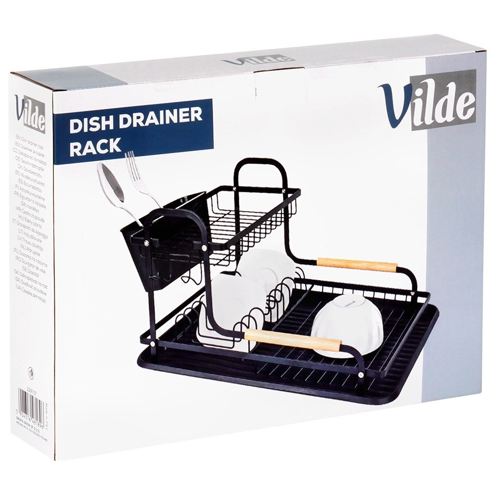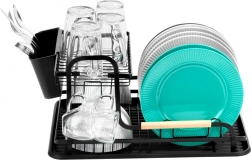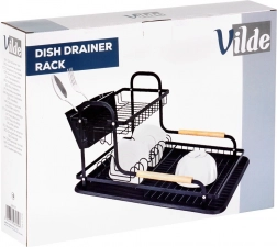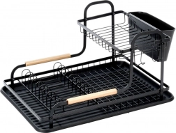 Robustní rám z odolného kovu v černé matné úpravě doplňují elegantní dřevěné rukojeti pro snadné přenášení. Vyjímatelný dvoukomorový košík na příbory pomáhá udržet pořádek a urychluje schnutí. Odkapávač se snadno čistí a je navržen pro každodenní komfort.
