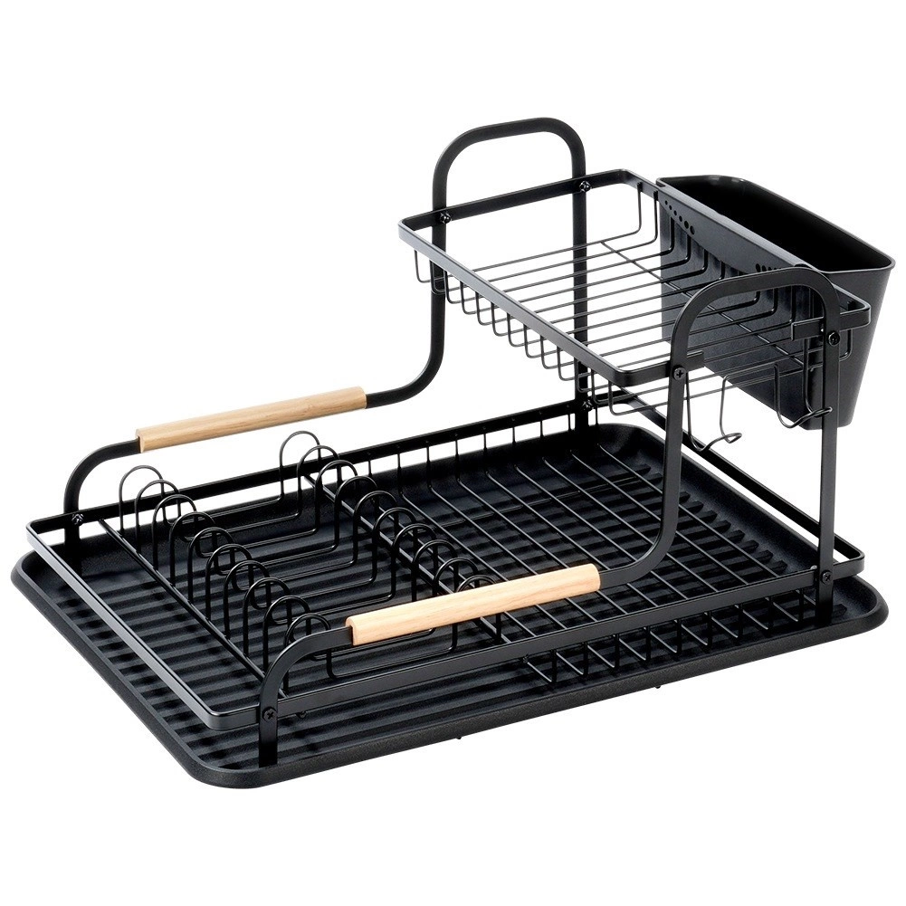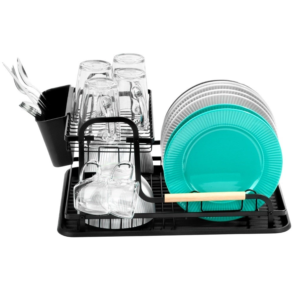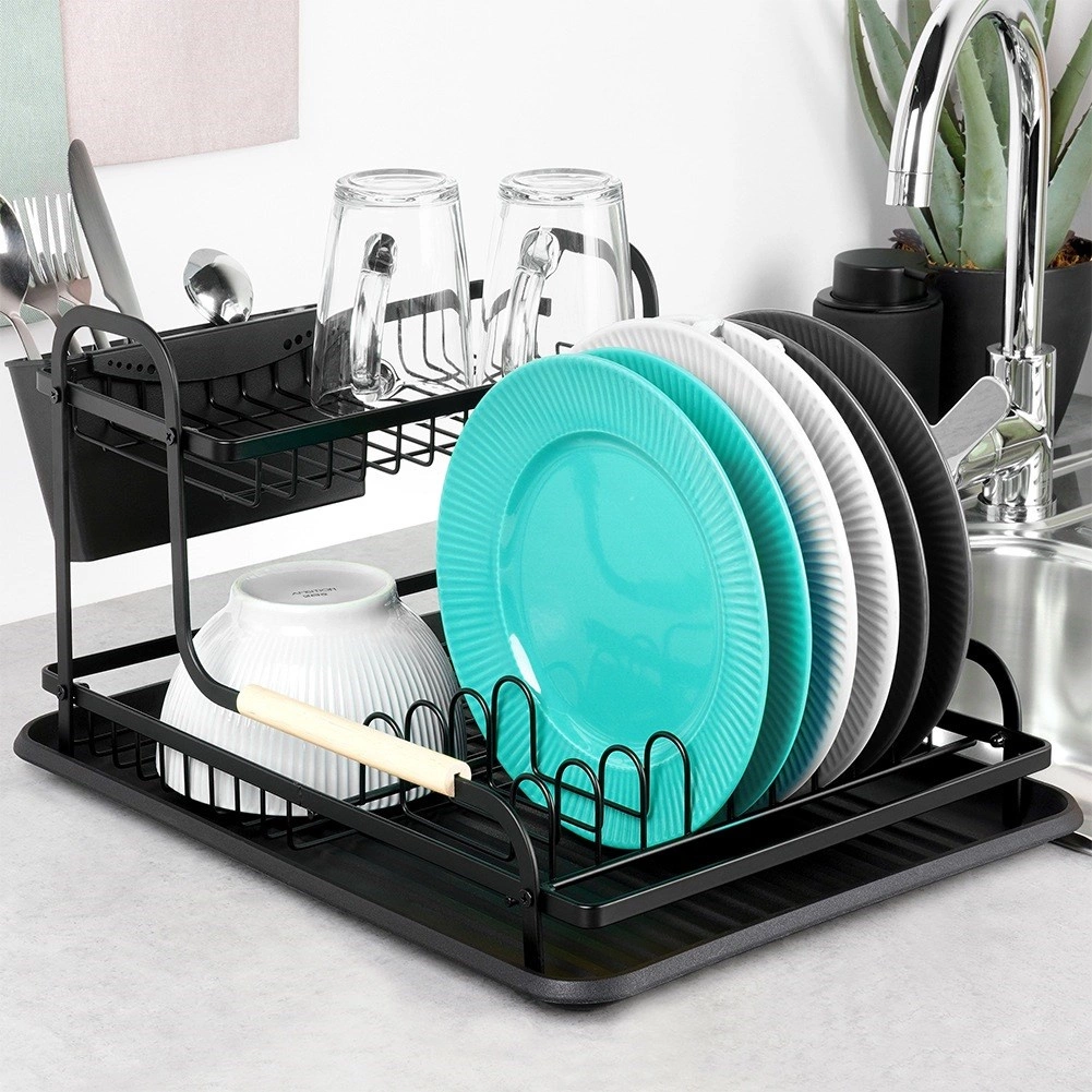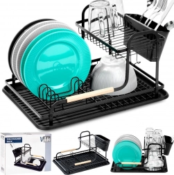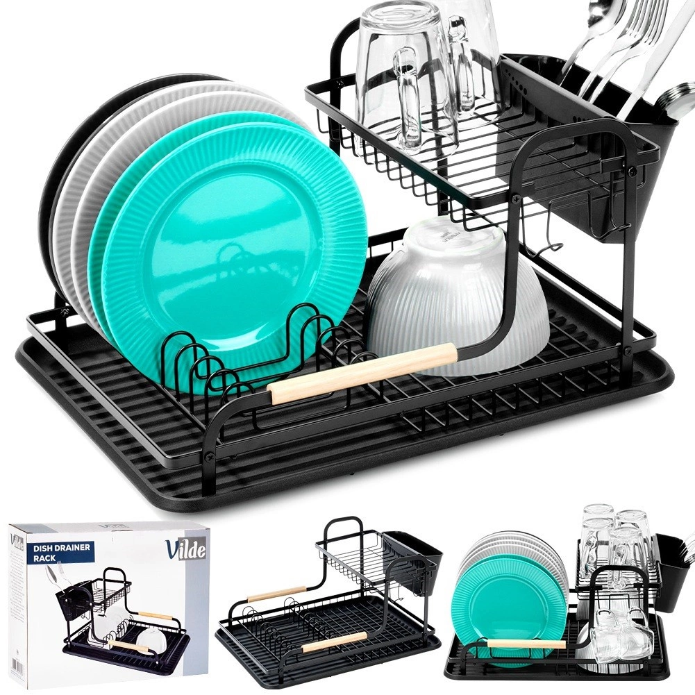 Stylový dvoupatrový odkapávač na nádobí s rozměry 48,5 × 32 × 23,5 cm efektivně organizuje talíře, sklenice i příbory a chrání pracovní desku před vodou. Kombinuje pevnou kovovou konstrukci v černé matné barvě s dřevěnými akcenty, má praktickou odkapávací misku a vyjímatelný dvoukomorový košík na příbory. Díky dvěma úrovním nabízí velkou kapacitu a rychlejší sušení nádobí v každé moderní i klasické kuchyni.