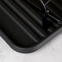Pevný kov v černé matné barvě, dřevěné rukojeti pro pohodlné přenášení a odkapávací miska, která chrání pracovní plochu.