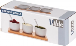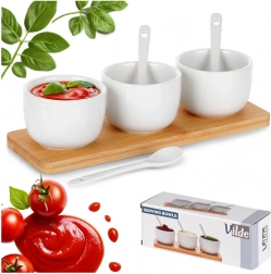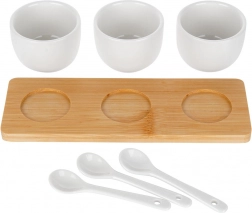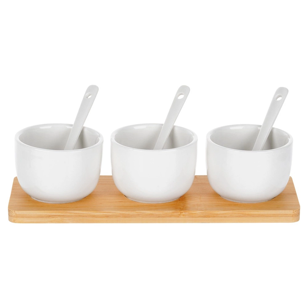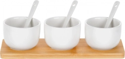 Tato 7dílná sada kombinuje minimalistický design a praktické detaily pro každodenní stolování i slavnostní příležitosti. Tři hladké bílé keramické mističky (90 ml) jsou uloženy v přesně frézovaných otvorech bambusového podnosu, takže se při přenášení nepohybují. Součástí jsou i ladící keramické lyžičky pro pohodlné nabírání.