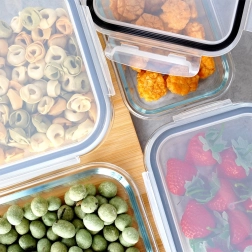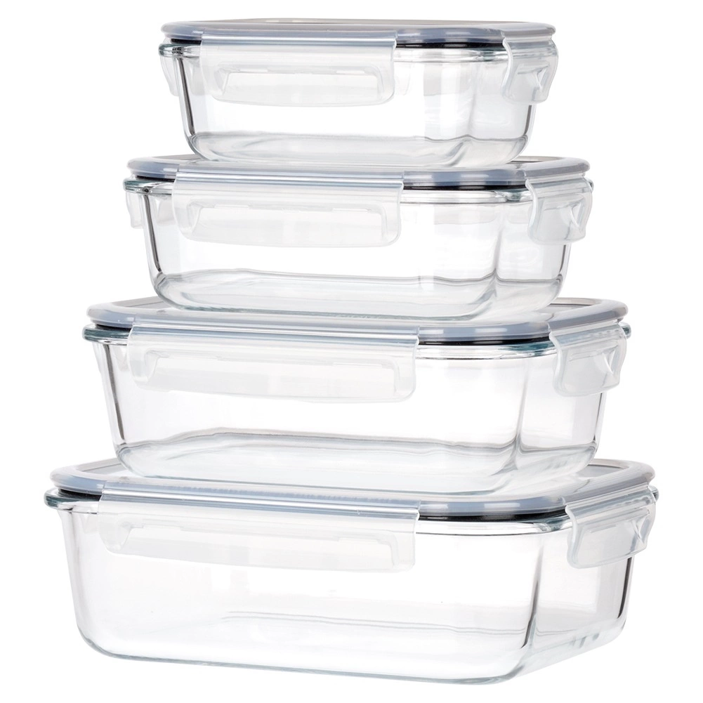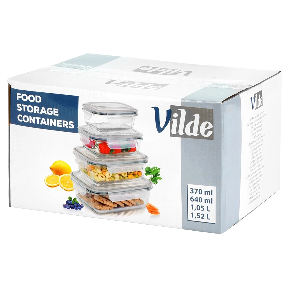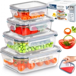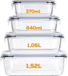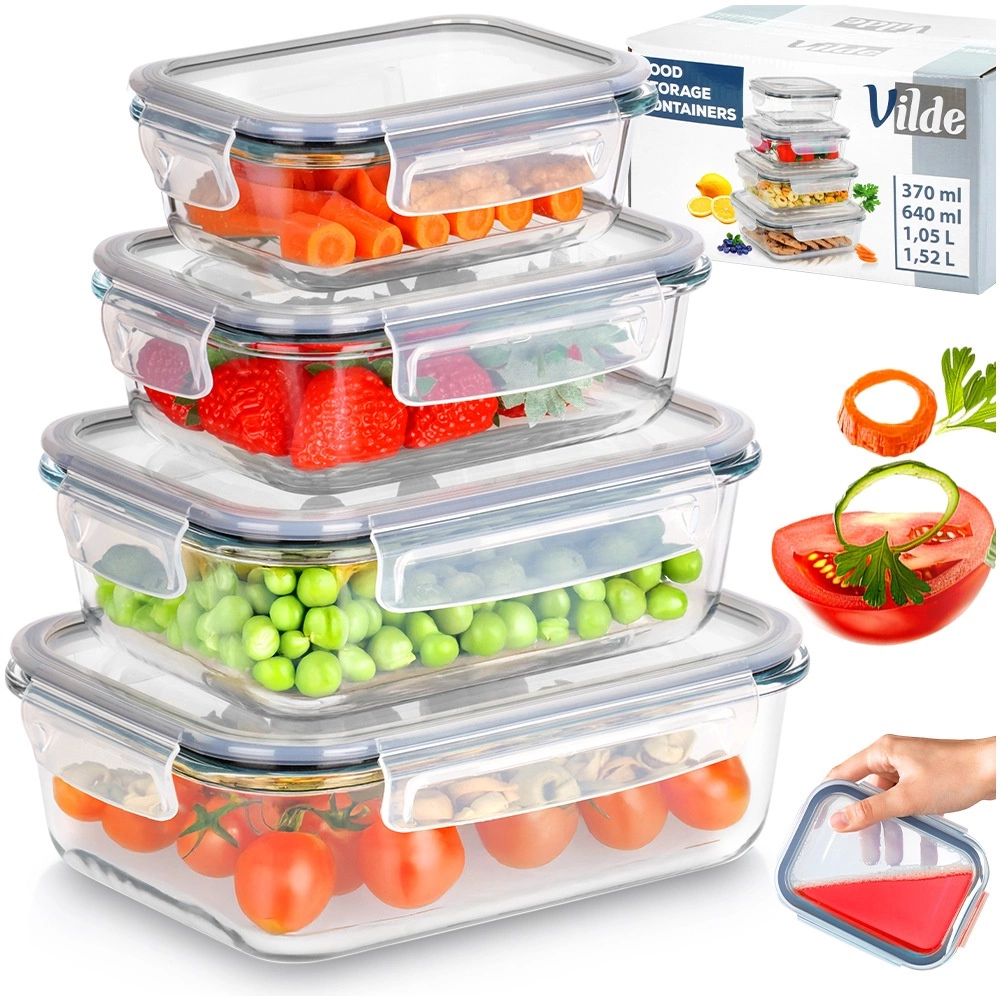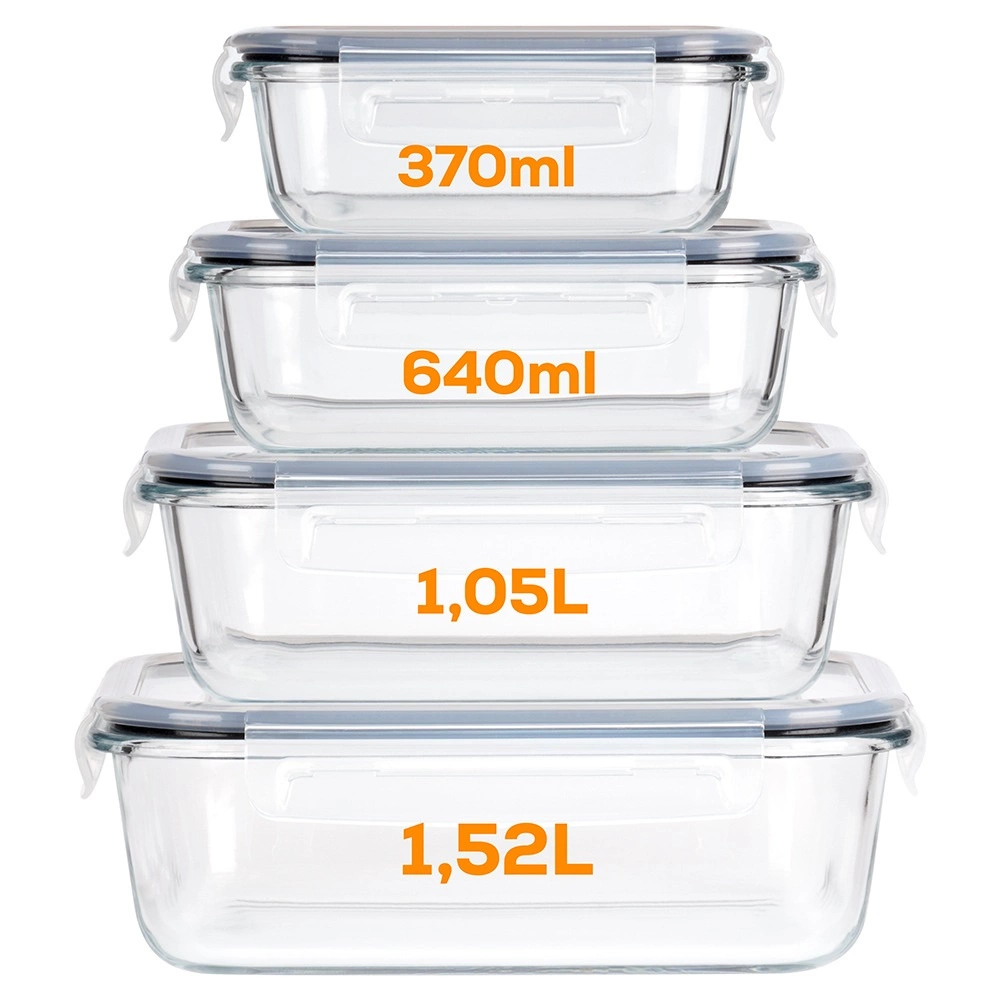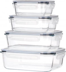 Sada čtyř skleněných dóz z borosilikátového skla s těsnícími víky a čtyřmi klipy pro bezpečné uzavření udrží vaše jídlo déle čerstvé. Díky různým velikostem a možnosti vnořeného skladování šetří místo a jsou ideální pro lednici, mrazák, mikrovlnku i troubu. Vzduchotěsné uzavření, odolné borosilikátové sklo, použití v troubě i mikrovlnce (bez víka) a snadná údržba v myčce.