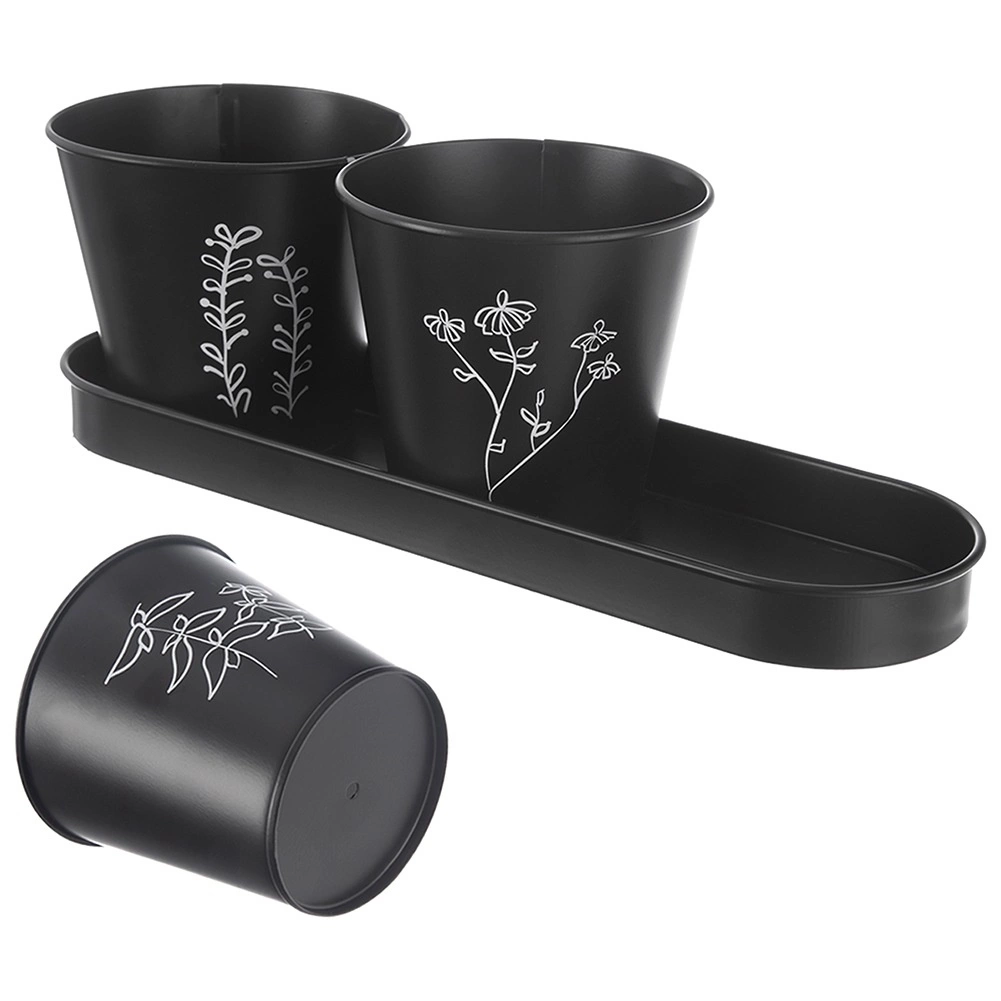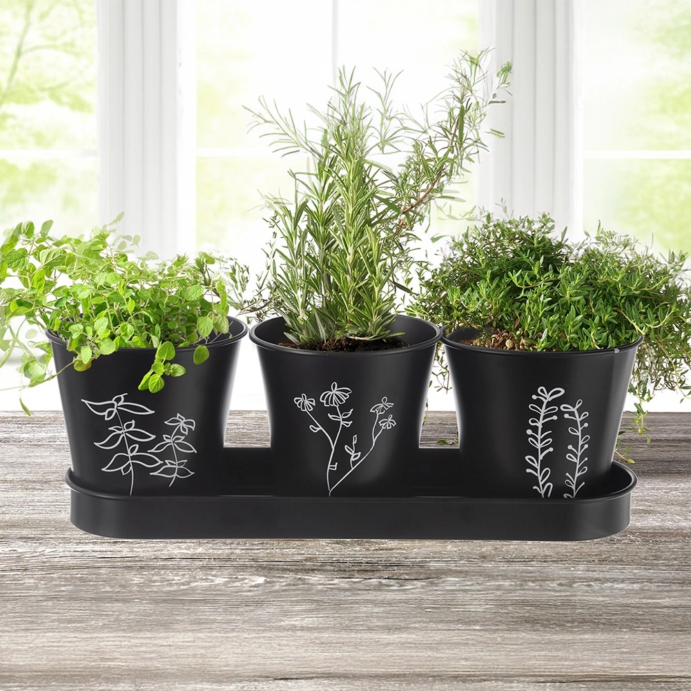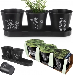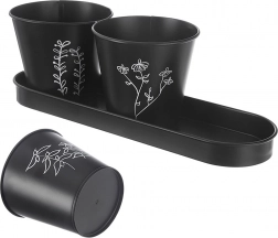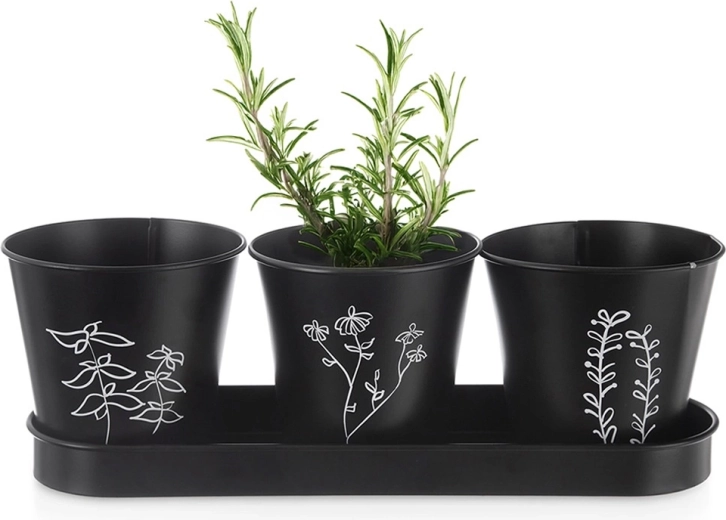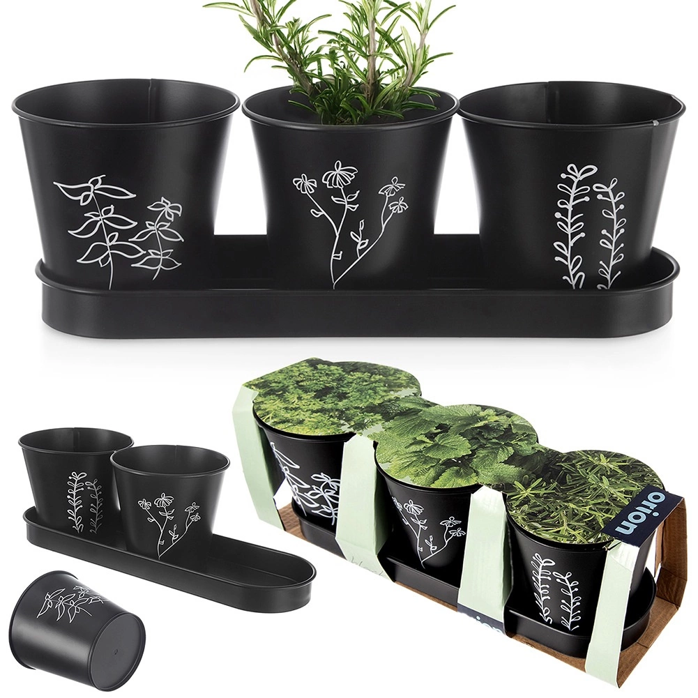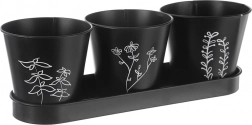 Elegantní sada tří květináčů s podmiskou pro pěstování čerstvých bylinek na parapetu či v kuchyni. Moderní černé provedení s rostlinným motivem a praktickým drenážním otvorem podporuje zdravý růst rostlin, zatímco podmiska zachytí přebytečnou vodu a udrží okolí čisté. Odolné kovové zpracování a univerzální design skvěle zapadne do moderních i klasických interiérů.