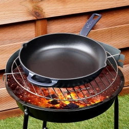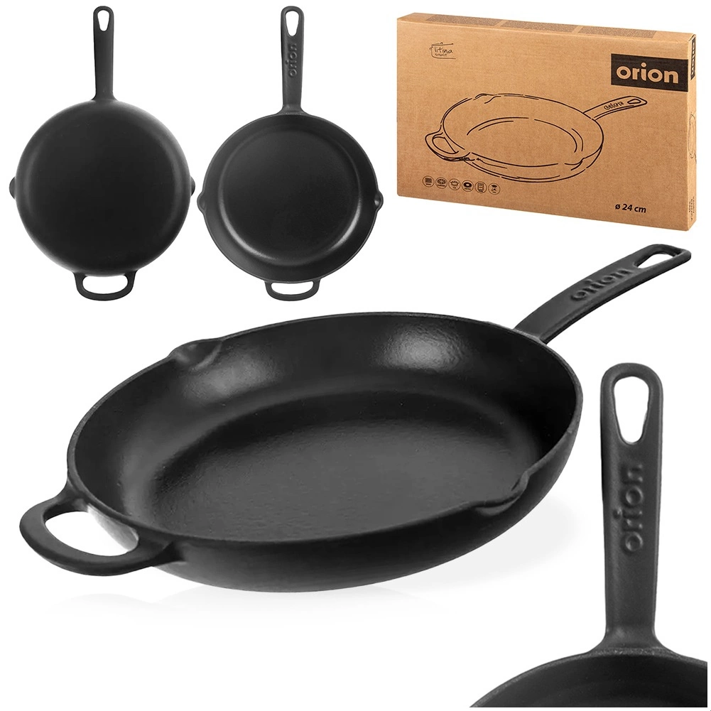 Díky výborné akumulaci tepla je pánev skvělá pro prudké opékání, dušení i pečení. Dlouhé madlo a pomocné ouško zajišťují bezpečný úchop, dvě boční výlevky usnadní slití šťáv a oleje. Vhodná na plyn, elektřinu, sklokeramiku, halogen i indukci a do trouby. Využijete ji doma v kuchyni, na grilu i při kempování.
