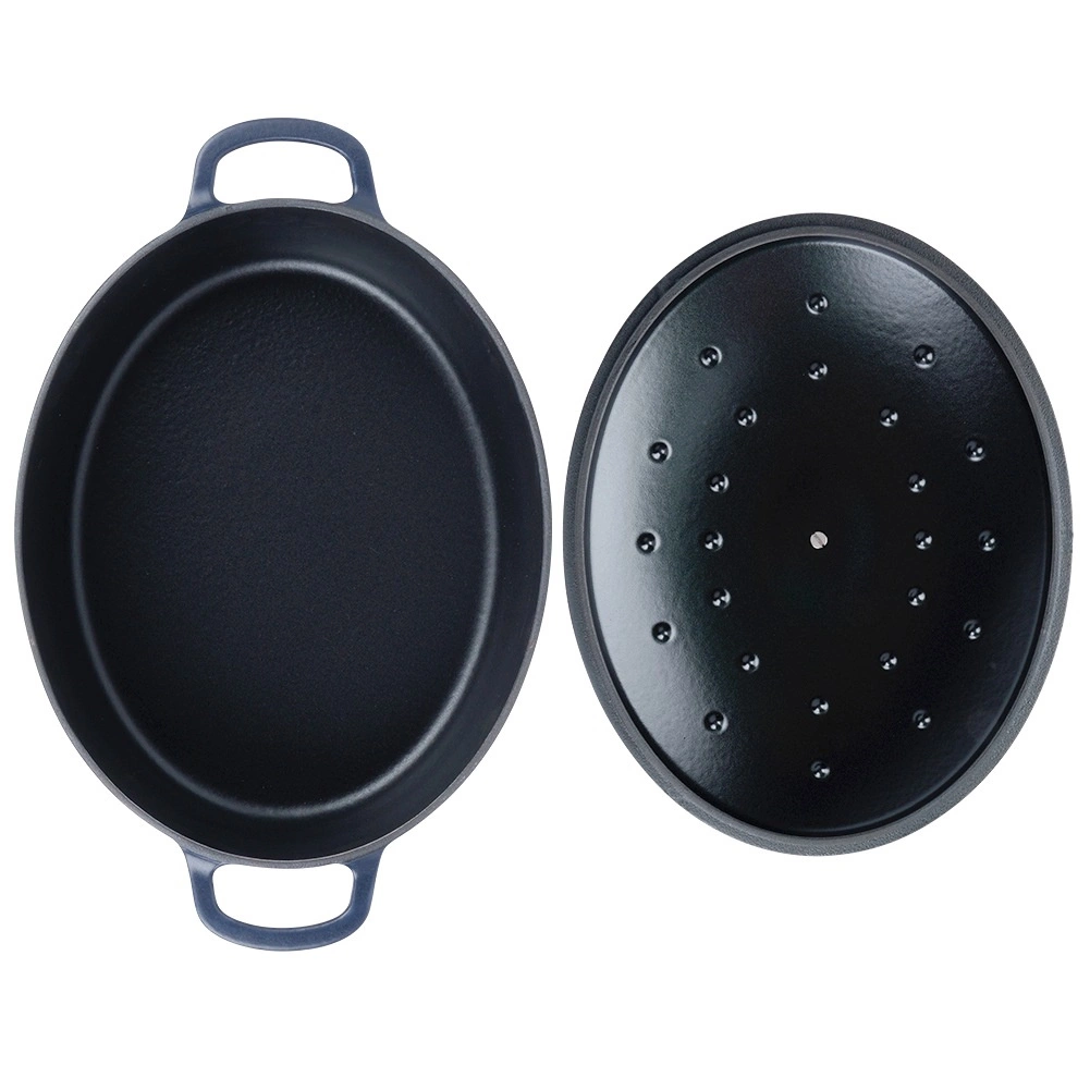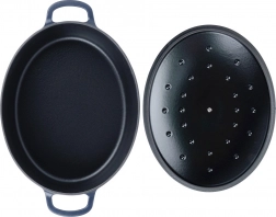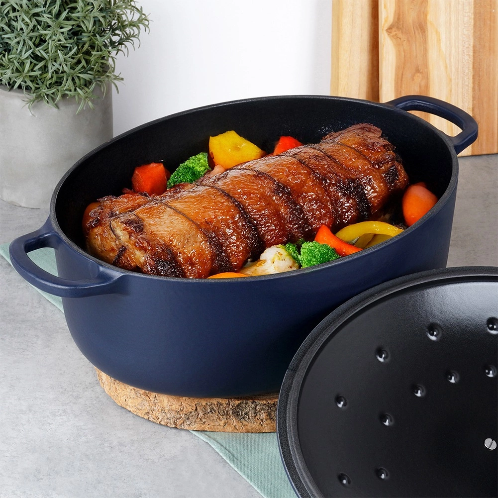 Objevte univerzální oválný pekáč z kvalitní smaltované litiny, ve kterém připravíte křehké pečeně, šťavnaté ragú i nadýchané zapékané pokrmy. Těžká litina se zahřívá rovnoměrně a dlouho udržuje teplotu, takže jídlo zůstane teplé i při servírování na stůl. Vnitřní černý smalt usnadňuje smažení a uvolnění šťáv, vnější tmavě modrý smalt dodá eleganci každé kuchyni.