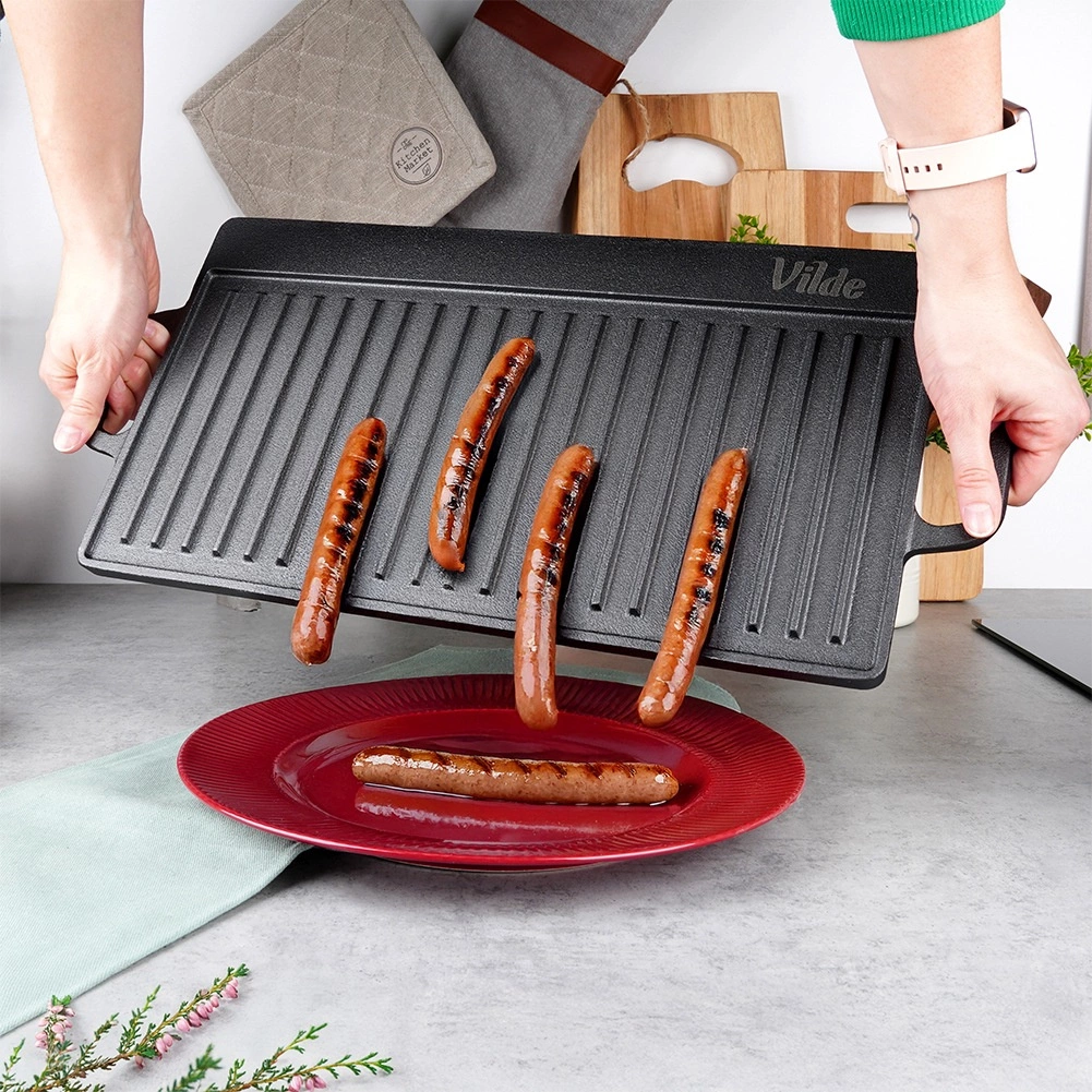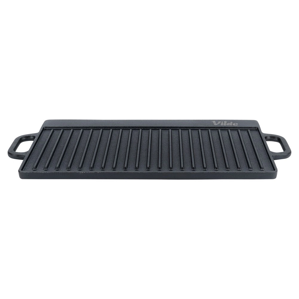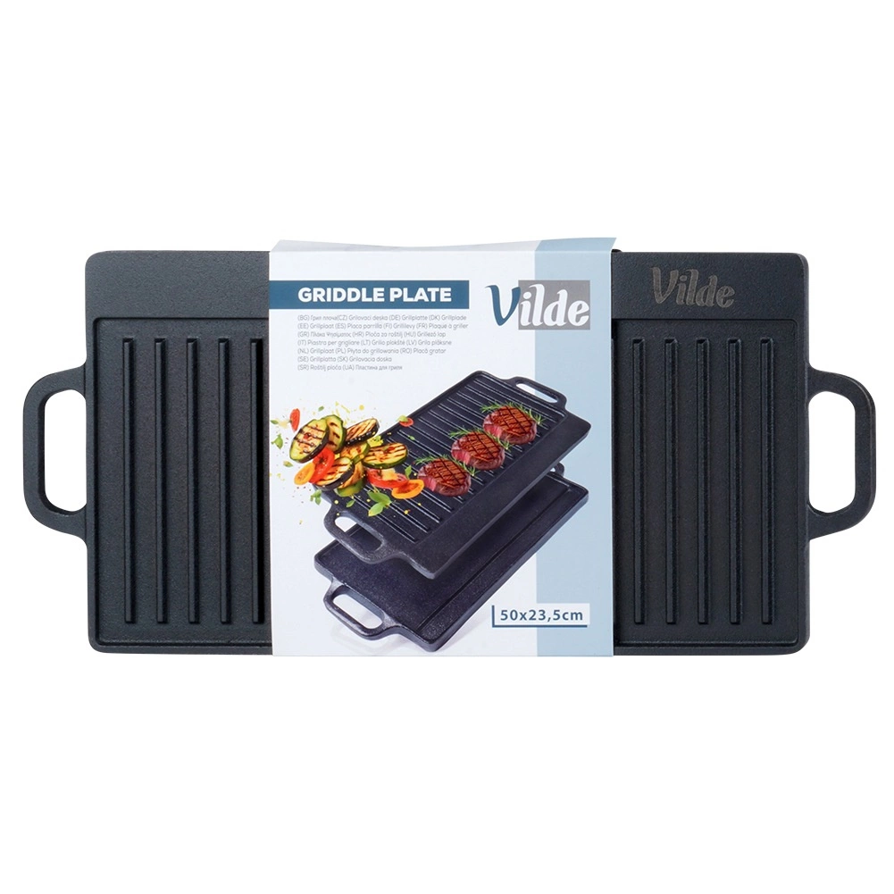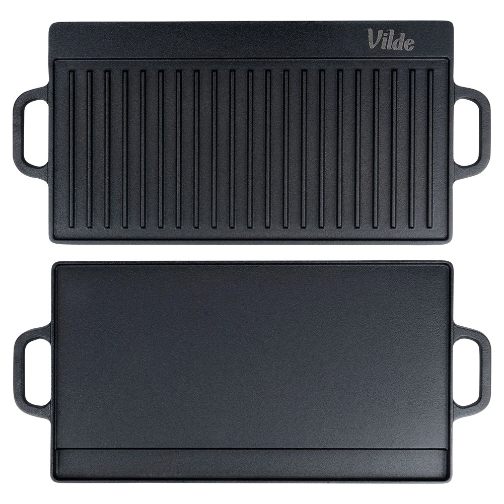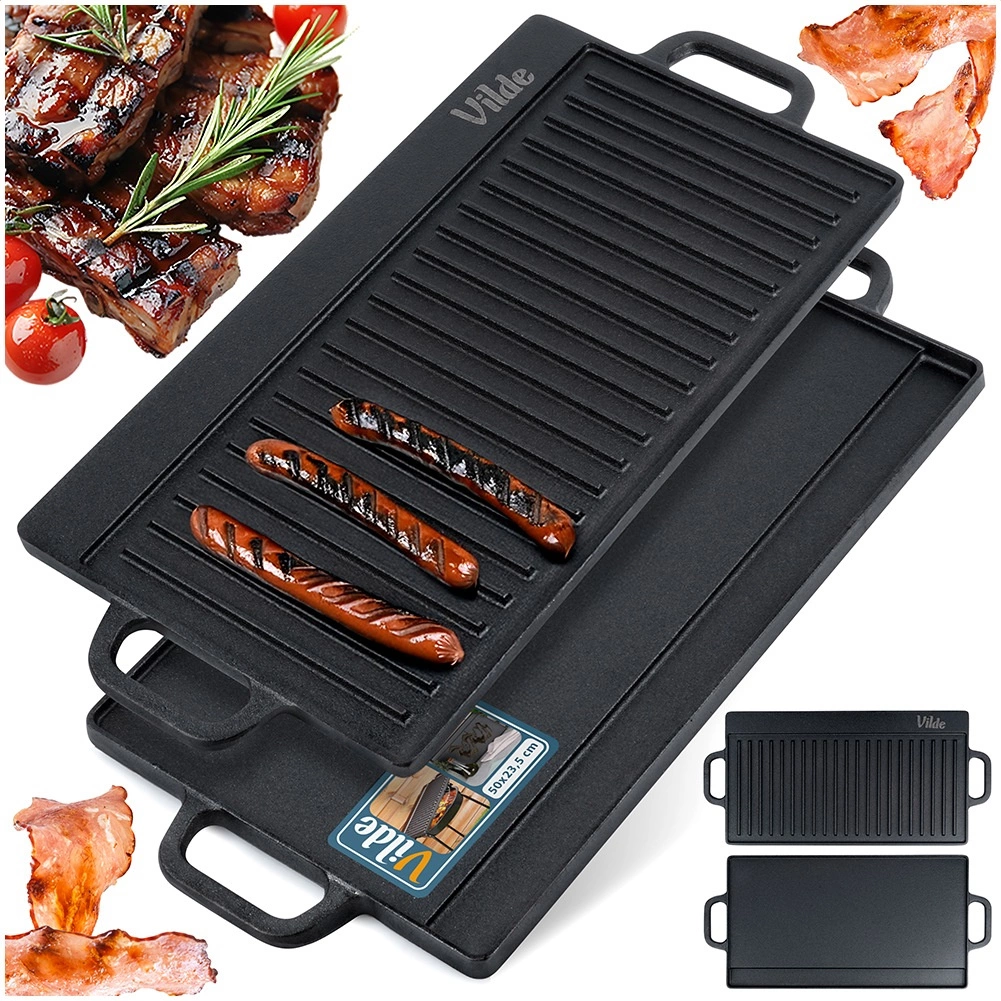 Univerzální oboustranná litinová grilovací deska CAST LINE o rozměrech 50,5 × 23,5 cm nabízí jednu žebrovanou a jednu hladkou stranu pro perfektní přípravu masa, ryb, zeleniny i steaků. Masivní litina skvěle rozvádí teplo a dlouho ho udržuje, takže dosáhnete rovnoměrného propečení a krásných sear proužků. Vhodná na gril, sporák i do trouby.