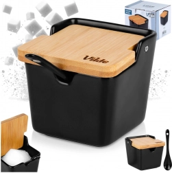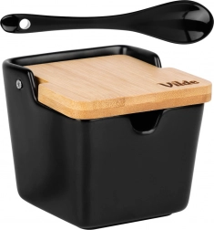 Tato stylová cukřenka v minimalistickém designu skvěle doplní každou kuchyni i jídelnu. Matná černá keramika v kombinaci s přírodním bambusem působí elegantně a současně je velmi praktická pro každodenní použití. Díky výklopnému víčku a výřezu pro lžičku máte cukr či sůl vždy po ruce a zároveň chráněné.