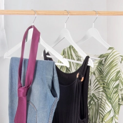 Díky robustní konstrukci jsou ramínka vhodná pro všechny typy oděvů – od jemných blůzek a košil až po těžší kabáty či saka. Promyšlené zářezy na ramenou pomáhají udržet ramínkové topy či šaty na místě a příčná tyč rozšiřuje možnosti zavěšení.