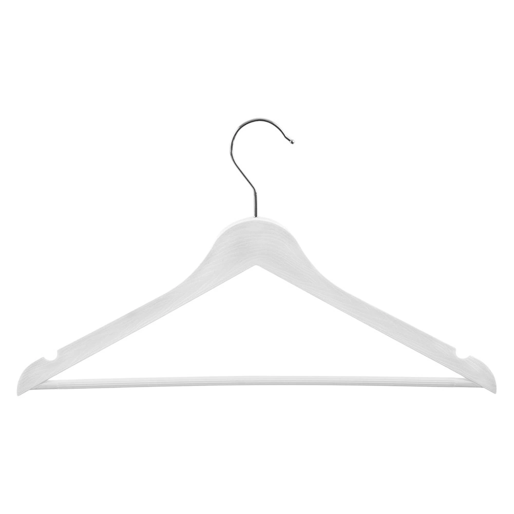 Sada tří univerzálních ramínek v bílé barvě pomůže udržet pořádek a přehled ve vaší skříni i prodejnách s oděvy. Povrch s imitací dřeva působí stylově, přitom je odolný a snadno se udržuje. Kovový otočný háček usnadní zavěšení v jakémkoli směru.