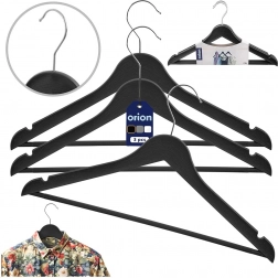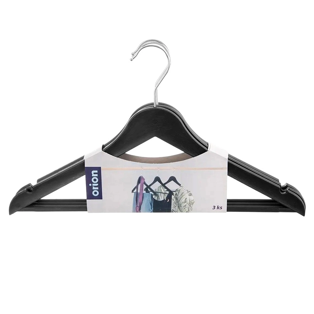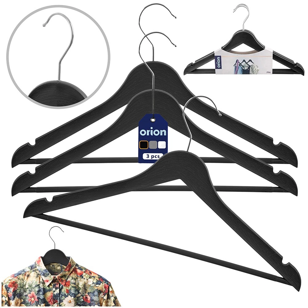 Praktická sada 3 ks černých ramínek s otočným kovovým háčkem pro perfektní organizaci šatníku. Ramínka s dekorem imitace dřeva mají zářezy na ramena a spodní tyč pro kalhoty či šály – ideální pro trička, košile, šaty i těžší kabáty. Univerzální použití, stylový vzhled a pevné provedení v jedné sadě.