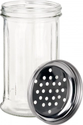 Praktický skleněný kořenek o objemu 350 ml s nerezovým víčkem s otvory pro pohodlné a kontrolované sypání. Vyroben z odolného silnostěnného skla, které je průhledné pro snadnou kontrolu obsahu. Ideální na sůl, pepř, bylinky či cukr, vhodný do domácnosti i gastronomie a lze mýt v myčce.
