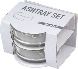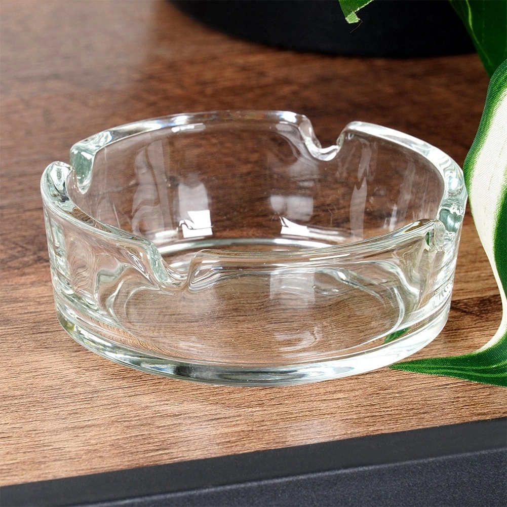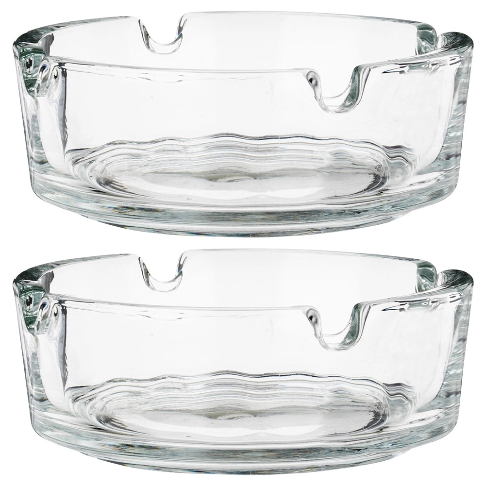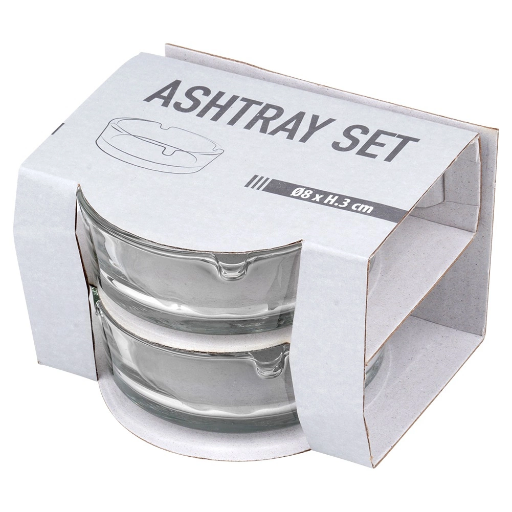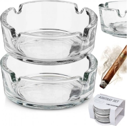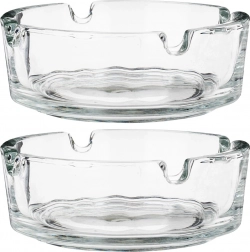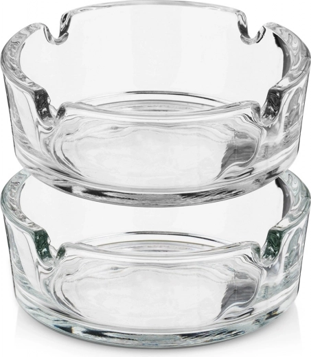 Praktická sada dvou skleněných popelníček o průměru 8 cm a výšce 3 cm pro každodenní použití doma i venku. Díky kompaktním rozměrům, odolnému silnostěnnému sklu a klasickému designu se hodí na balkón, terasu, do zahrady i do restaurací, barů a hotelů. Každá popelníčka má 4 zářezy pro pohodlné odložení cigarety a snadno se čistí.