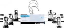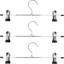 Sada 3 kovových věšáků s klipsy pro přehledné uložení kalhot, sukní i dalších oděvů. Nastavitelné posuvné klipsy s gumovými vložkami pevně drží látku bez poškození a šetří místo ve skříni. Odolné provedení v elegantní stříbrné barvě.