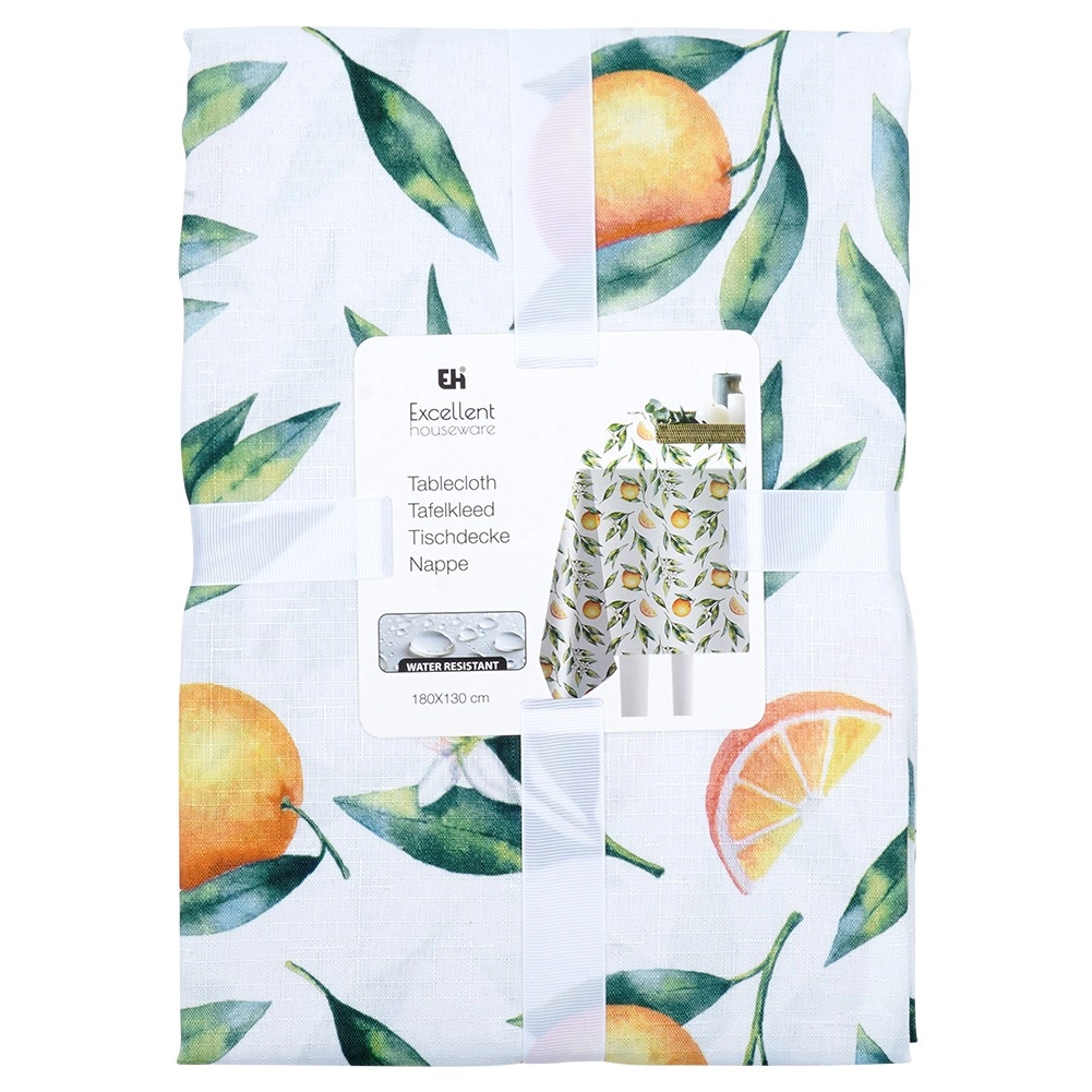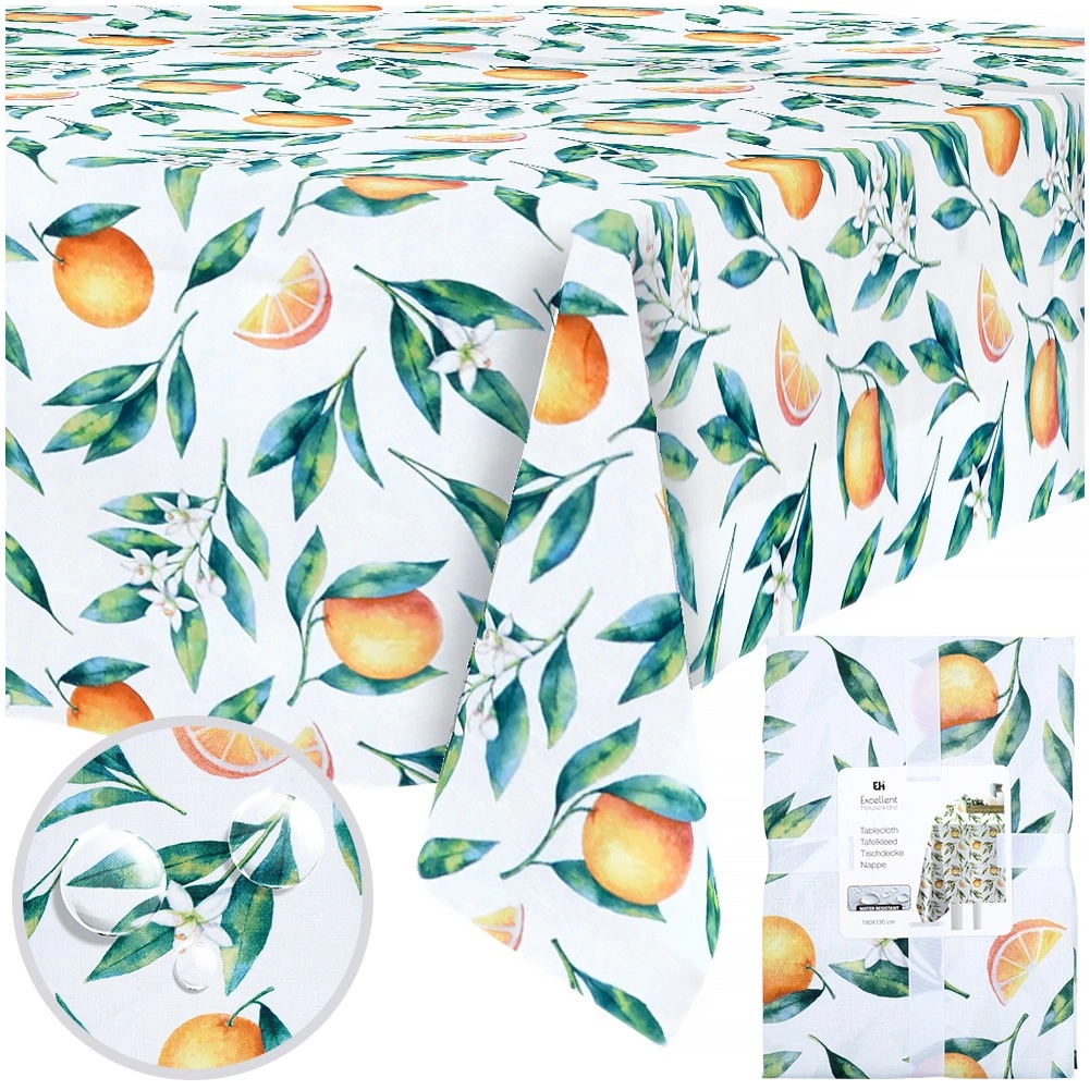 Tento obdélníkový ubrus o rozměrech 180 × 130 cm vyniká svěžím potiskem pomerančů, listů a květů, který okamžitě rozzáří jídelnu, kuchyni i zahradní posezení. Kvalitní polyester zajišťuje dlouhou životnost, snadnou údržbu a příjemný spád přes okraje stolu.