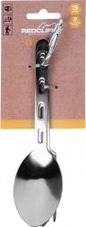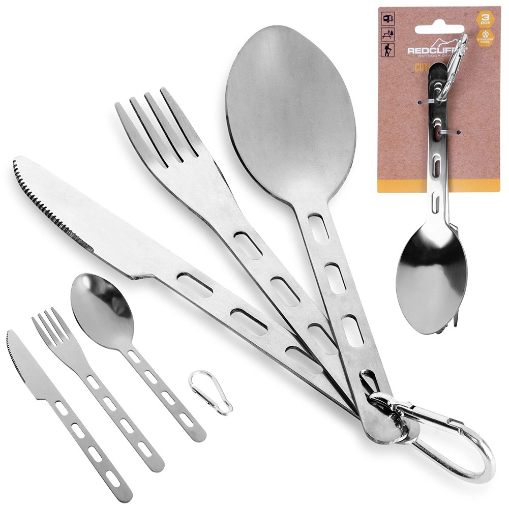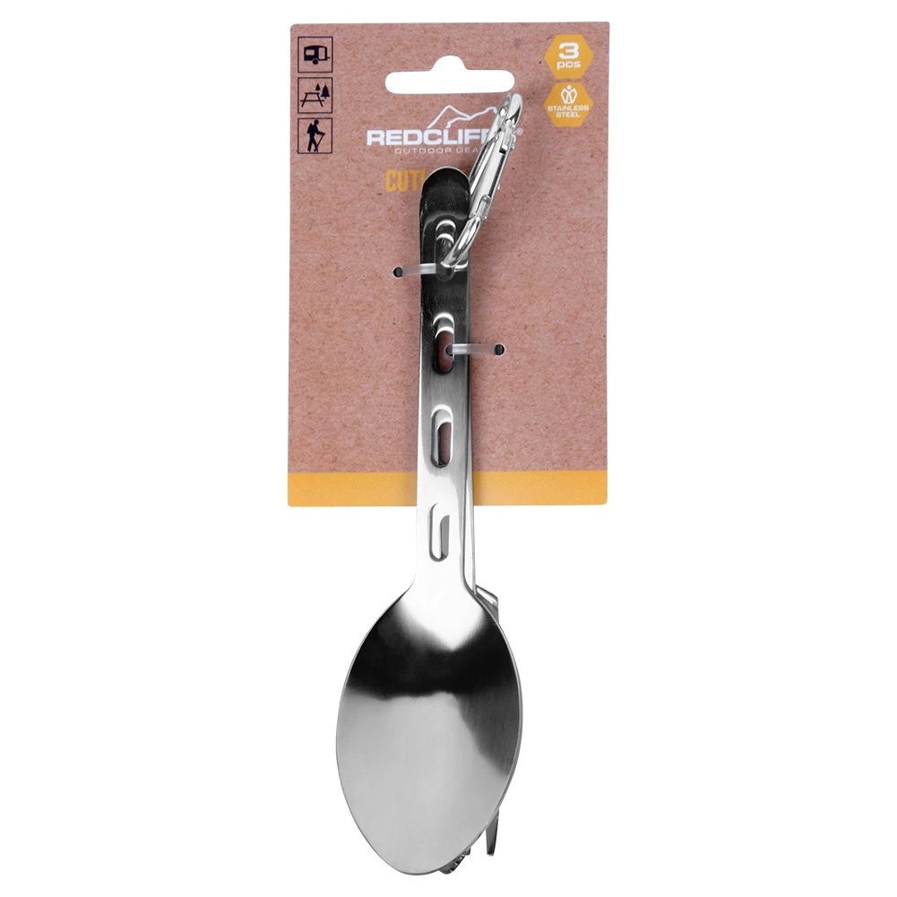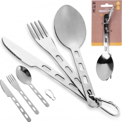 Sada turistického příboru je spolehlivým společníkem pro každé outdoorové dobrodružství. Díky nerezové oceli je příbor odolný proti korozi, pevný a současně snadno udržovatelný. Všechny tři části drží pohromadě praktická karabina, která usnadňuje zavěšení na batoh či opasek a brání ztrátě jednotlivých kusů.