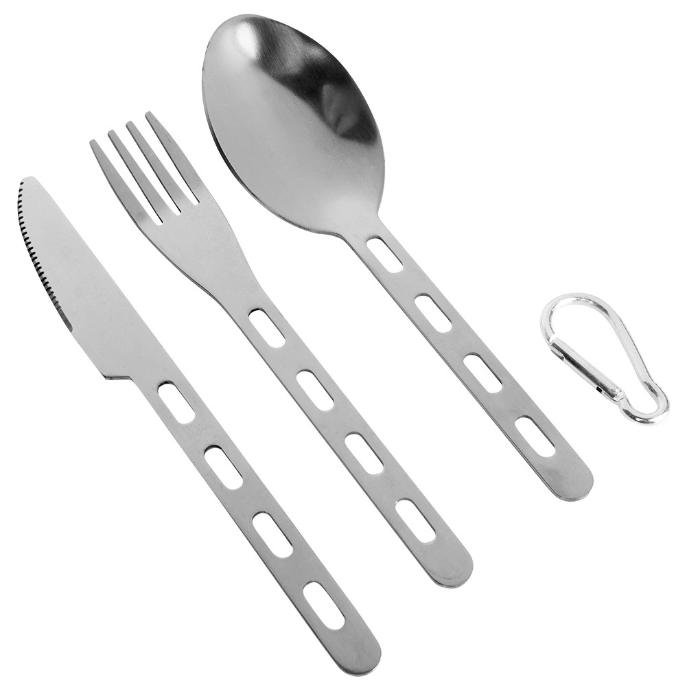 Plnohodnotná lžíce, vidlička a nůž se zubatým ostřím pro snadné krájení zajistí komfortní jídlo kdekoliv venku.