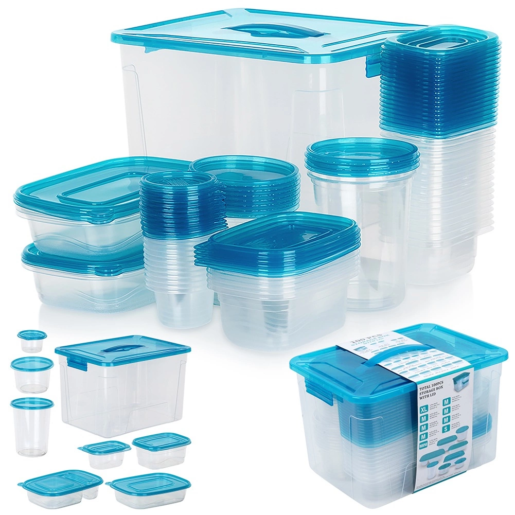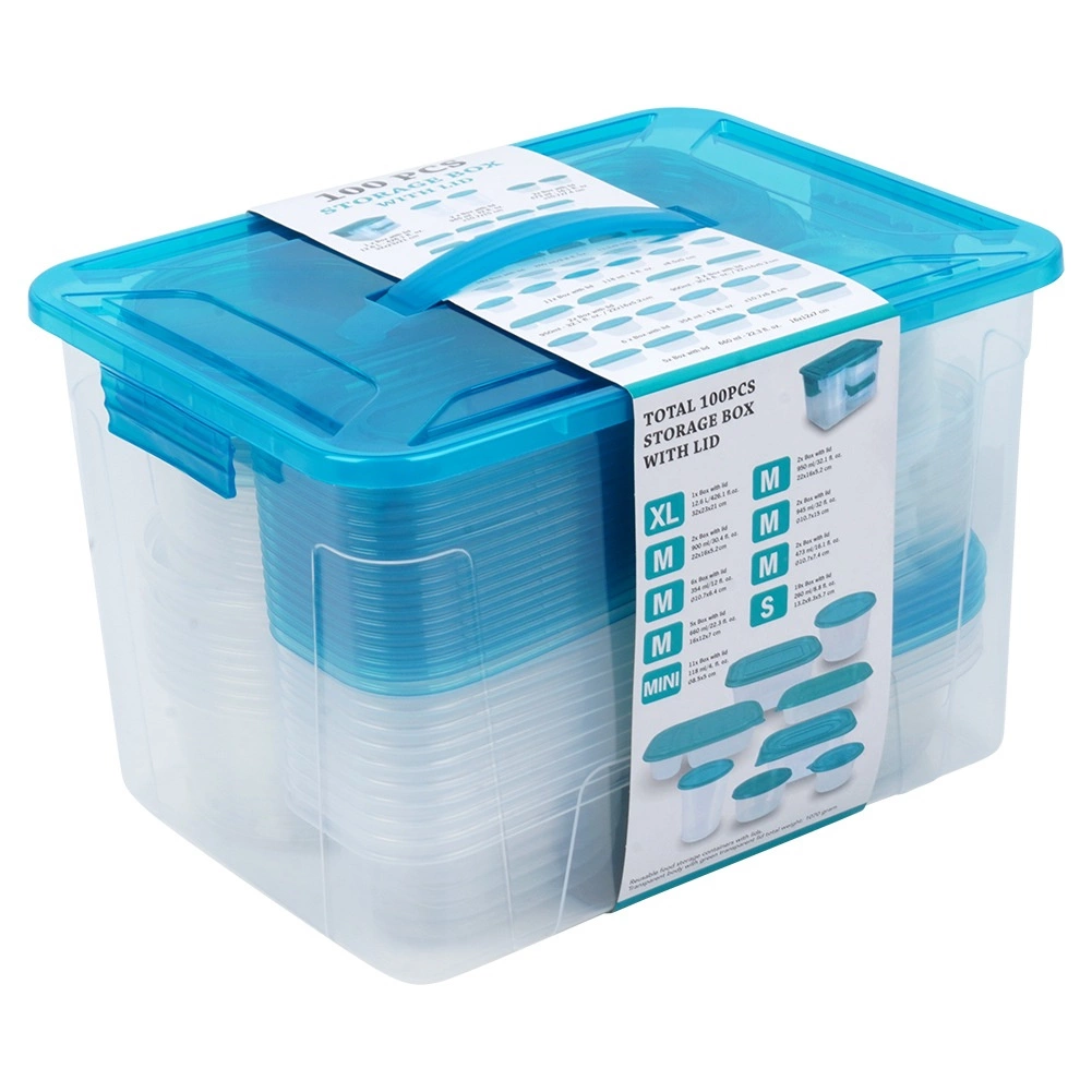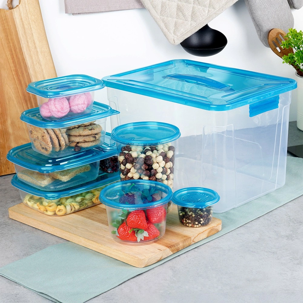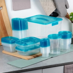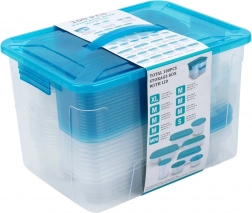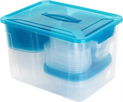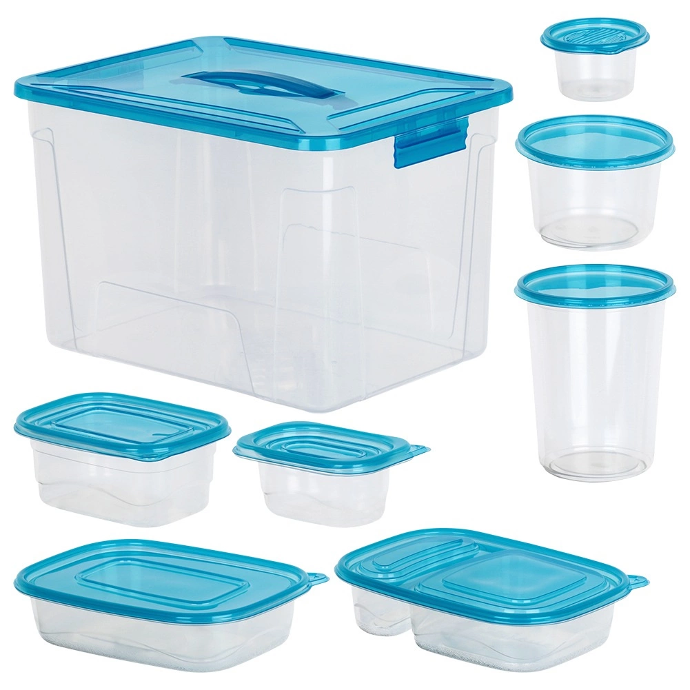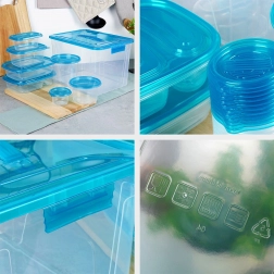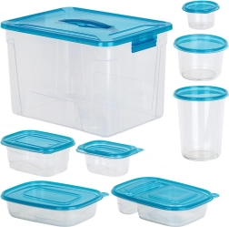 Praktická sada průhledných dóz na potraviny s modrými víčky v devíti velikostech pro každodenní použití. Vzduchotěsné uzavření udrží jídlo déle čerstvé, stohovatelný a vkládací design šetří místo a velký box s rukojetí umožní snadné uložení celé sady. Dózy jsou bezpečné pro potraviny, vhodné do lednice, mrazáku, myčky i mikrovlnky (ohřev bez víčka).