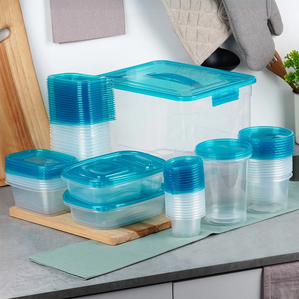 Tato všestranná sada 50 ks zahrnuje mix kulatých a obdélníkových dóz pro přehledné skladování surovin, hotových jídel i svačin. Průhledné stěny poskytují jasný přehled o obsahu, zatímco pevná víčka zajišťují spolehlivé utěsnění proti úniku vůní a vysychání.