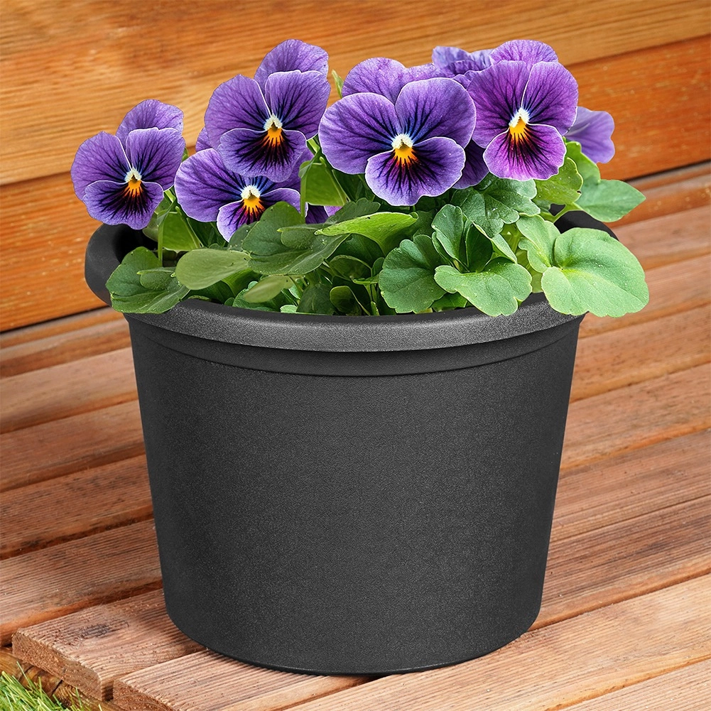 Klasický kulatý tvar a černá barva se hodí na balkon, terasu i k vchodovým dveřím. Rostliny v něm krásně vyniknou.