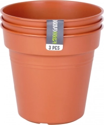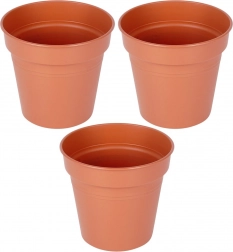 Praktická sada 3 plastových květináčů s horním průměrem 13 cm a výškou 12 cm je skvělou volbou pro pěstování bylinek, balkonových i pokojových rostlin. Klasický kulatý tvar a cihlový odstín se hodí do každého interiéru i na balkon, terasu či zahradu. Lehký, odolný materiál usnadňuje manipulaci a čištění.